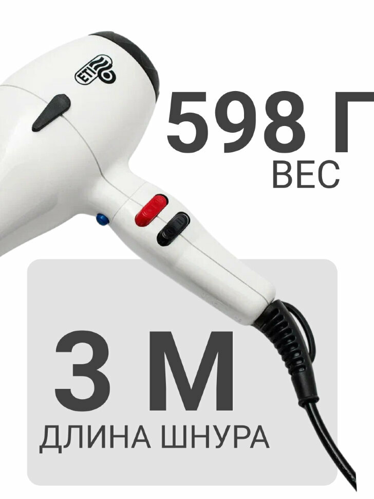 Профессиональный фен ETI Micro Stratos 3600 белого цвета - воплощение мощности и стиля. Создан для интенсивной работы в условиях салона с большим потоком посетителей.