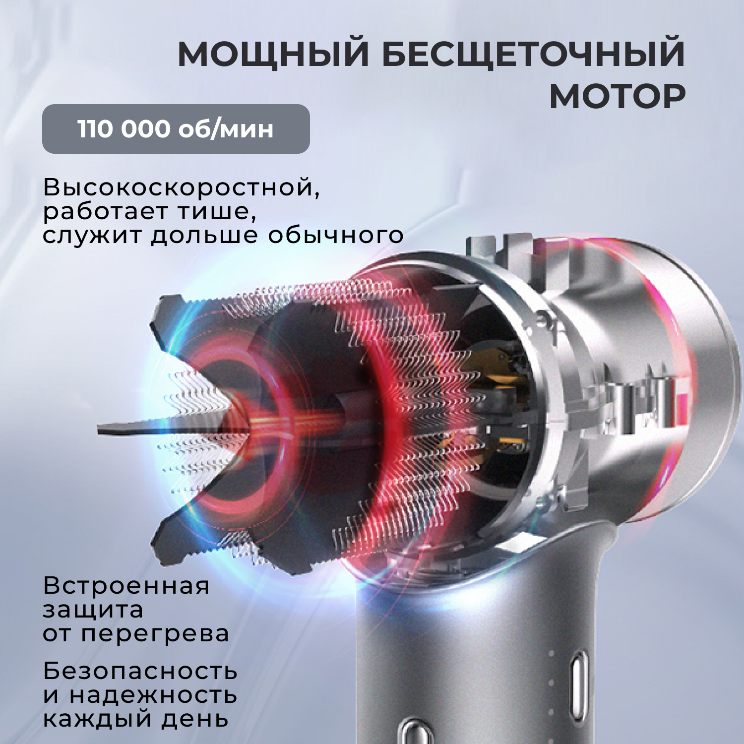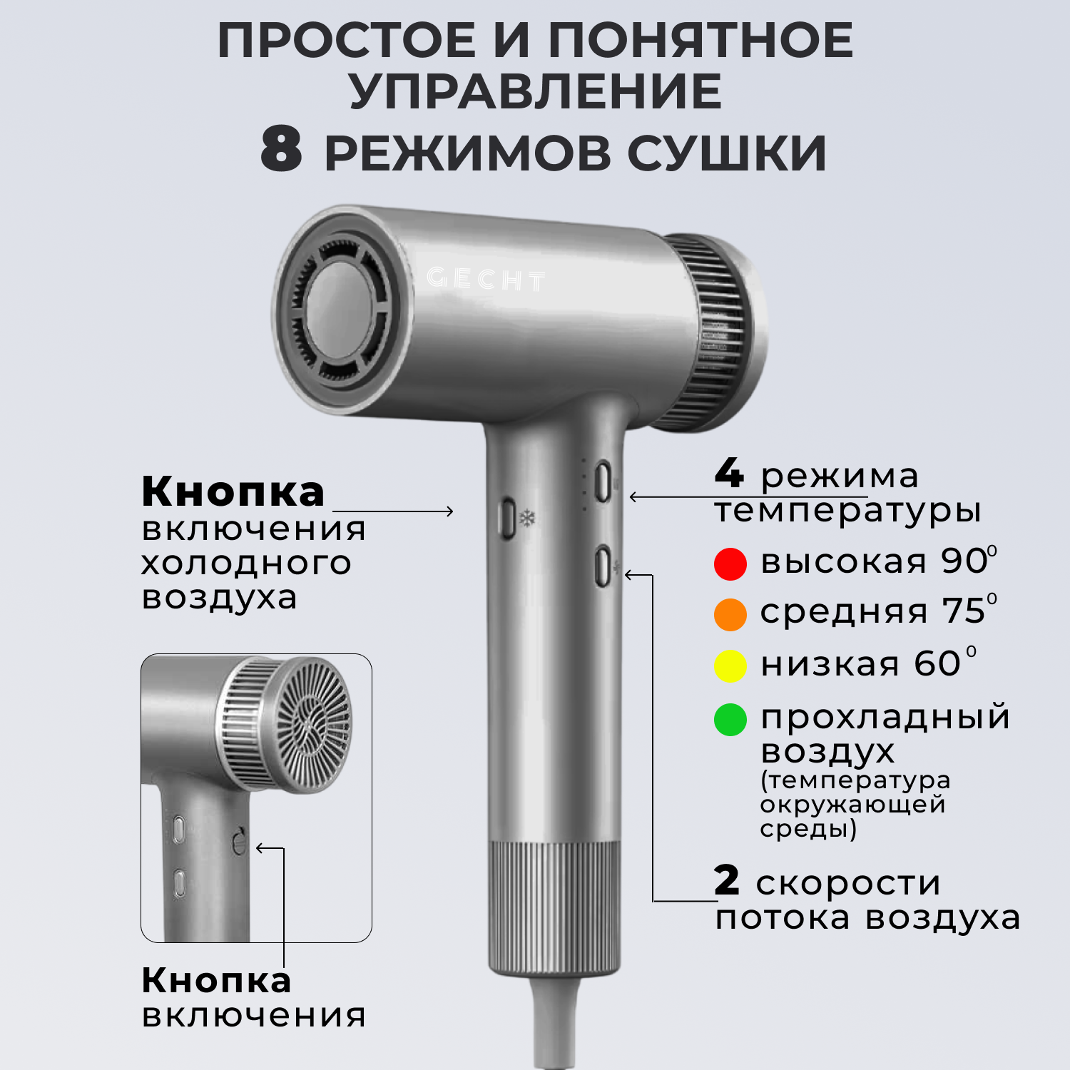 Профессиональный фен от бренда Gecht с двумя магнитными насадками для сушки и укладки подойдет для всех типов волос, для женщин, мужчин и детей. У фена Gecht есть функция запоминания режимов, благодаря которой после включения питания, скорость потока воздуха и температура сохраняют те же значения, которые были установлены до последнего выключения питания. Встроенный ионизатор обеспечивает защиту волос и сохраняет их здоровье. Ионизация помогает убрать статическое электричество и сделать волосы более послушными, гладкими и блестящими. Мощный бесщеточный мотор делает работу прибора бесшумной и бесперебойной. Он оснащен защитой от перегрева и системой автоматического отключения, четыре температурных режима, два уровня скорости, кнопку быстрого переключения на холодный обдув. Бережный уход за вашими волосами без пересушивания. Стильный эргономичный дизайн и приятный цвет серый металлик.