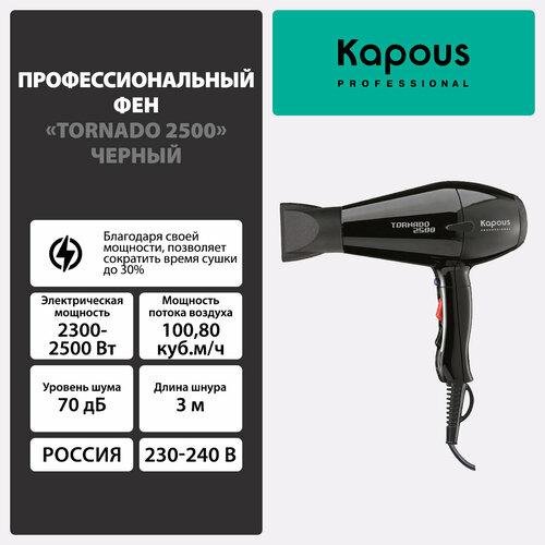 Профессиональный фен для волос с повышенной мощностью модель Tornado-2500 Kapous Professional. Идеально подходит для длительных и сложных укладок волос! Благодаря своей мощности и распределению воздушного потока, позволяет сократить время сушки до 30%. Эргономичная ручка и переднее расположение кнопок для регулировки позволяет работать как левой, так и правой рукой. Вес, мощность и малошумность фена обеспечивает комфортное выполнение укладок волос.