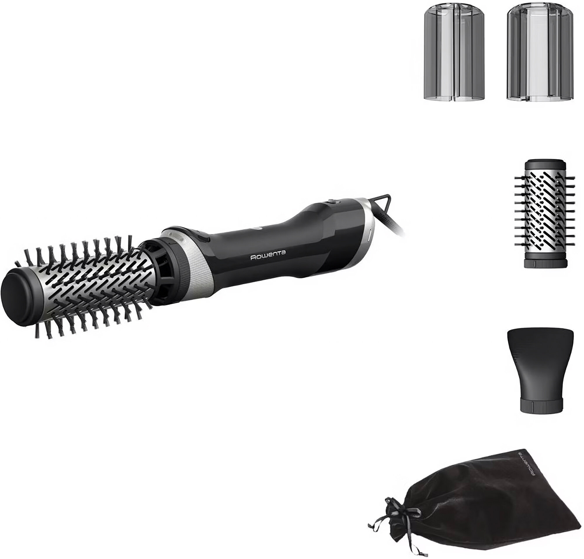 2 вращающиеся насадки (40/50 мм) для всех типов волос, концентратор для укладки направленным потоком воздуха и чехол для хранения в комплекте.