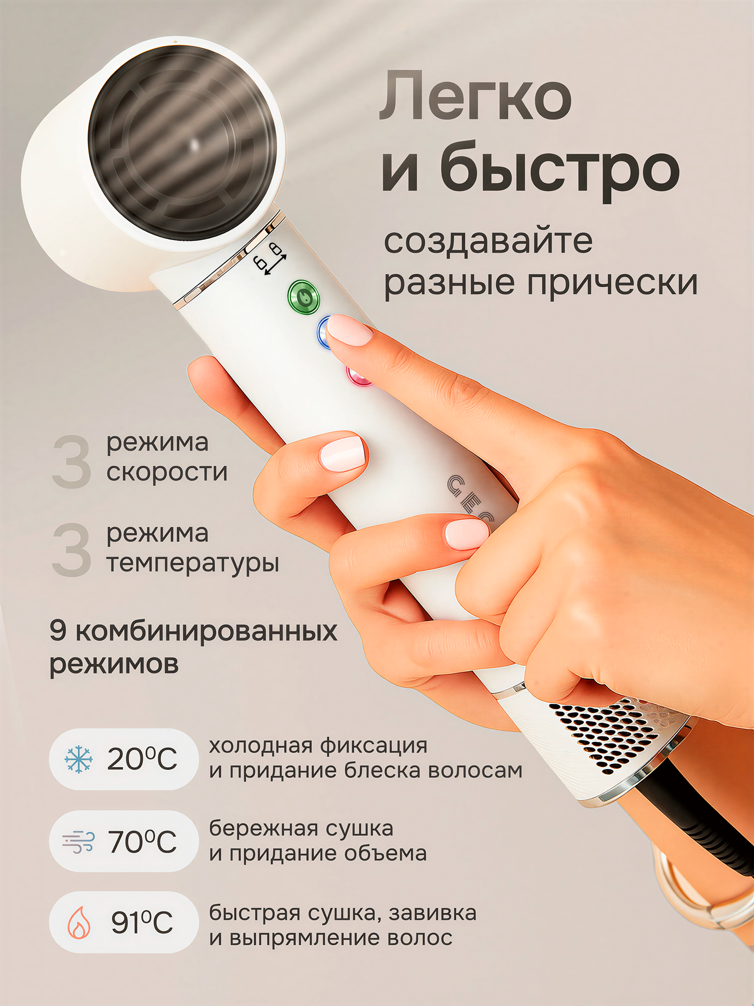 | Дополнительная информация | эффект Коанда, встроенная ионизация, бережная сушка, волосы не электризуются, BLDC мотор |