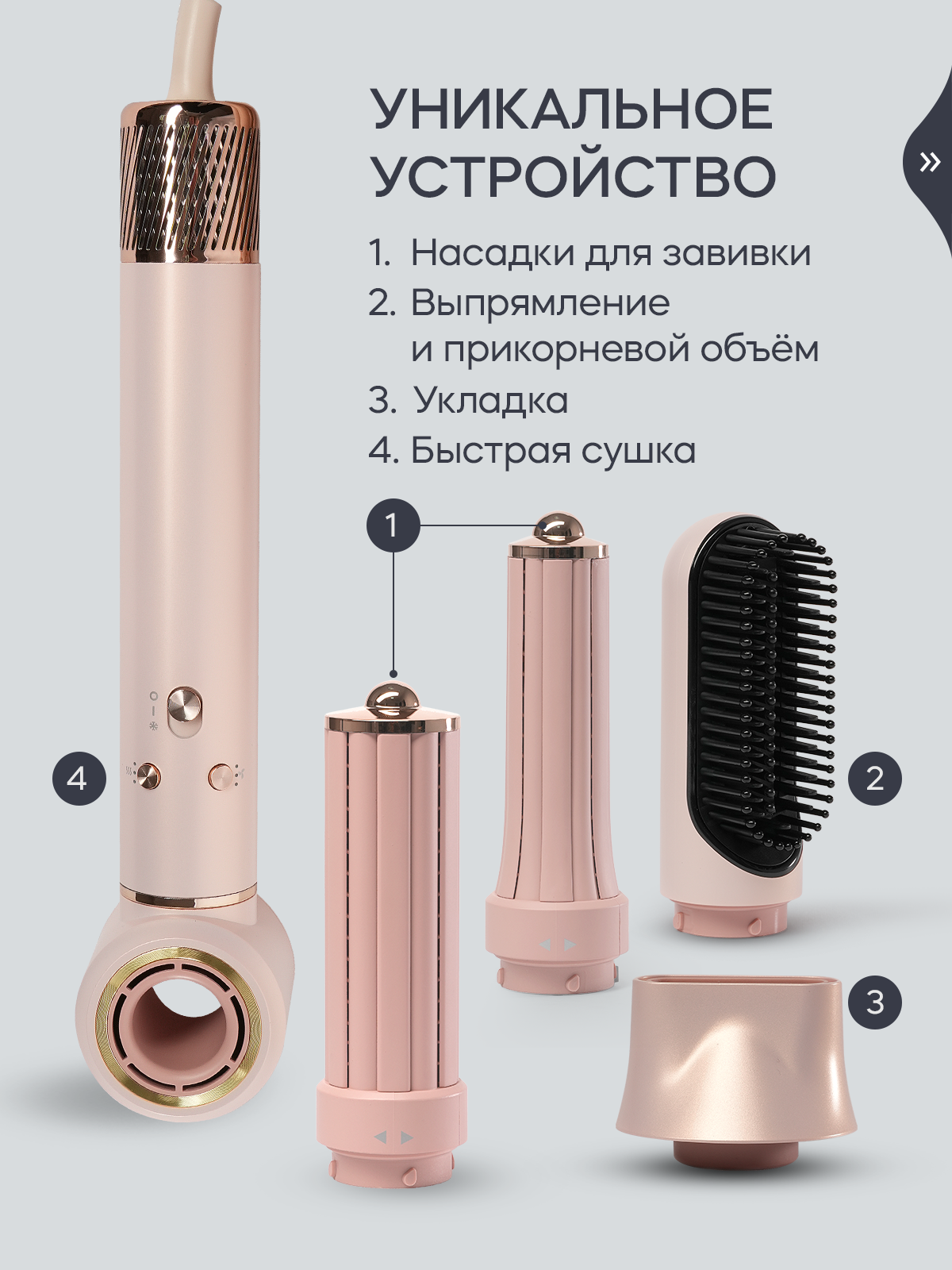 Купить Фен стайлер для волос Gecht профессиональный, 5 насадок для сушки и укладки, ионизация, BLDC мотор, 5в1, розовый с доставкой по всей России.