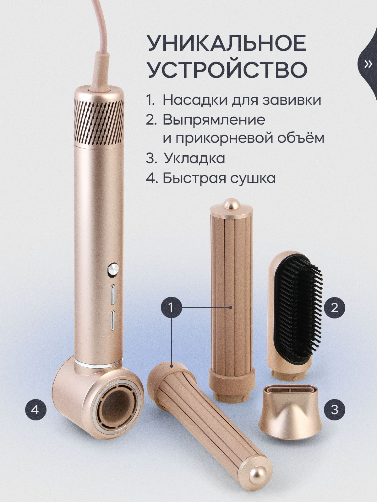 | Насадки | для бережного высушивания, для выпрямления, для непослушных волос, для спиральной укладки, концентратор, направленный поток, расческа, цилиндрическая, щетка |