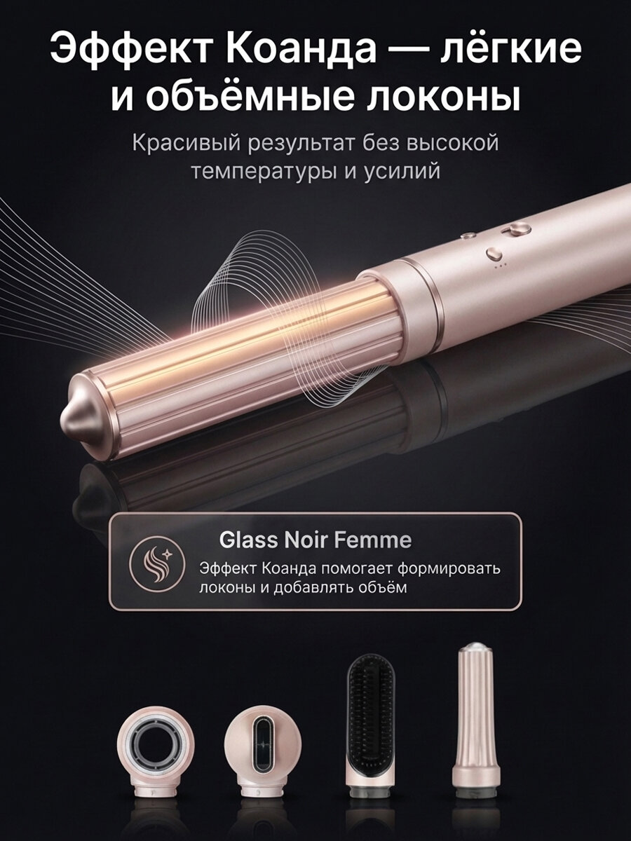 | Подробная комплектация | 5 профессиональных насадок: концентратор, расческа, насадки для завивки 30 и 40 мм, насадка-фен Стильная сумка для хранения Термостойкий корпус, не нагревающийся при работе |