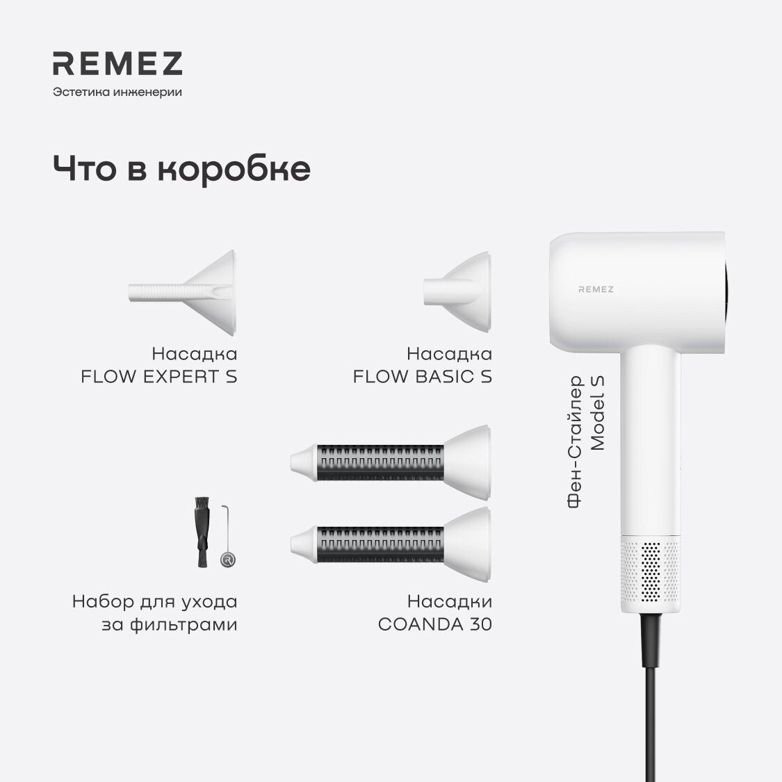 Фен-стайлер REMEZ Model S с функцией Sensor, турмалиновые насадки для локонов Coanda, ионизация, 9 режимов: сравнение цен, характеристики, фото, актуальное наличие и цены.