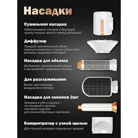 Многофункциональный электрический фен 7 в 1 - универсальное приспособление для ухода за волосами! Стайлер от нашего бренда поставляется в комплекте семью сменными насадками разной формы: концентратором воздушного потока, диффузором для очерченных прядей, щеткой - расческой для разглаживания волос и круглой щеточкой для брашинга, создания прикорневого объема или разглаживания кудрявых локонов. Также в наборе насадка для легкой и быстрой сушки перед укладкой и две насадки с эффектом коанда для создания упругих кудрей. Инструмент имеет три температурных и скоростных режима работы. Компактный и легкий портативный фен очень удобно держать в руке во время использования. На ручке расположены кнопки управления аппаратом. Благодаря функции ионизации он защищает волосы от воздействия горячего воздуха и обеспечивает их более быстрое восстановление. С его помощью вы легко справитесь с укладкой мечты на коротких и длинных, тонких и густых, прямых и волнистых локонах. Это отличный выбор для ухода за женскими и мужскими волосами любого типа. Фен с возможностью регулировки температуры и скорости воздушного потока оборудован длинным шнуром для подключения к сети. Длина кабеля составляет 2 метра. Прибор мощностью 1400 Вт имеет прочный пластиковый корпус и подойдет для ежедневного использования. Это супер - помощник для взрослых женщин и мужчин, девушек и парней. Такая техника понравится профессиональным парикмахерам. Это хороший выбор, чтобы завивать красивые локоны, укладывать челку и делать разнообразные прически на каждый день или на праздник. Стайлер высокого качества с функцией завивки и выпрямителя легко уложит даже непослушные и пушистые волосы. Он поставляется в фирменной, удобной для хранения упаковке. Модель с длинным проводом удобно использовать дома и в поездках. Это техника, которая подчеркнет ваш стиль, сохранит здоровье и красоту волос. У нас есть акции и распродажи, вы можете купить наши товары в подарок со скидкой!