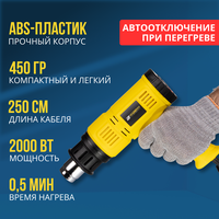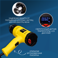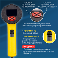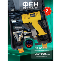 Преимущества: LCD дисплей, 2 режима скорости подачи воздуха, регулировка температуры 60-650℃, легкий и простой в управлении, мощный двигатель на 2000 вт, набор насадок (4 шт), режим обдува холодным воздухом.