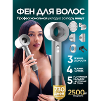 Профессиональный фен - мощный прибор быстро высушивает, придает объем, создает красивую укладку. Комплект из 5 насадок, 4 уровня нагрева, 3 скорости! Нагрев до 100 градусов быстро высушивает мокрые волосы, 80 градусов (стандартный уход), 60 градусов (бережная сушка теплым воздухом), 28 градусов (обдув холодным воздухом). Набор сменных магнитных насадок: круглая насадка (бережное высушивание), диффузор, насадка для направленного воздушного потока с широким соплом, для непослушных волос и концентратор с узким соплом. У модели длинный шнур (кабель - провод) - можно использовать компактный прибор с комфортом, с полной свободой движений, даже если электрическая розетка далеко. Переключатели функций управляются удобными кнопками на корпусе фена. Плюсы: функции ионизации, защита от перегрева, фен с диффузором для кудрей сушит и ухаживает за волосами, защищает от повреждения прядей и воздействия высоких температур. Универсальный электронный прибор мощностью 2500 Вт удобно использовать дома, как дорожный фен и в путешествиях. Бытовая техника удобной формы подходит для всех типов волос и кожи головы: нормальных, сухих, жирных, вьющихся, кудрявых, прямых, волнистых, пушистых, тонких, коротких, длинных, локонов средней длины, любой густоты. Бесшумный портативный прибор с несколькими насадками для разных типов волос и для укладки объемной челки подойдет для взрослых женщин, мужчин, парней, девушек, девочек, мальчиков, подростков. Профессиональный ручной маленький фен для ухода в домашних условиях! Многофункциональный фен стайлер с регулировкой температуры высушивания для красоты и здоровья волос удобно держать в руках, он легкий и тихий. Фен упакован в большую картонную коробку. Перед отправкой проходит проверку на работоспособность.