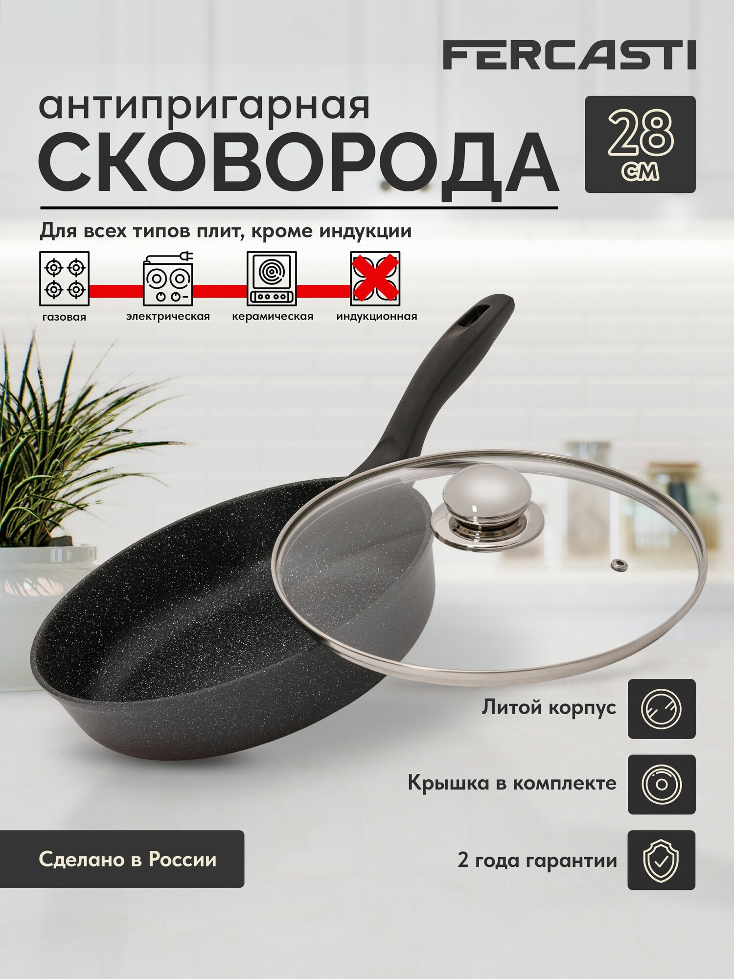 FERCASTI Сковорода 28 см с крышкой антипригарная литая алюминиевая, для газовых и электрических типов плит: сравнение цен, характеристики, фото, актуальное наличие и цены.