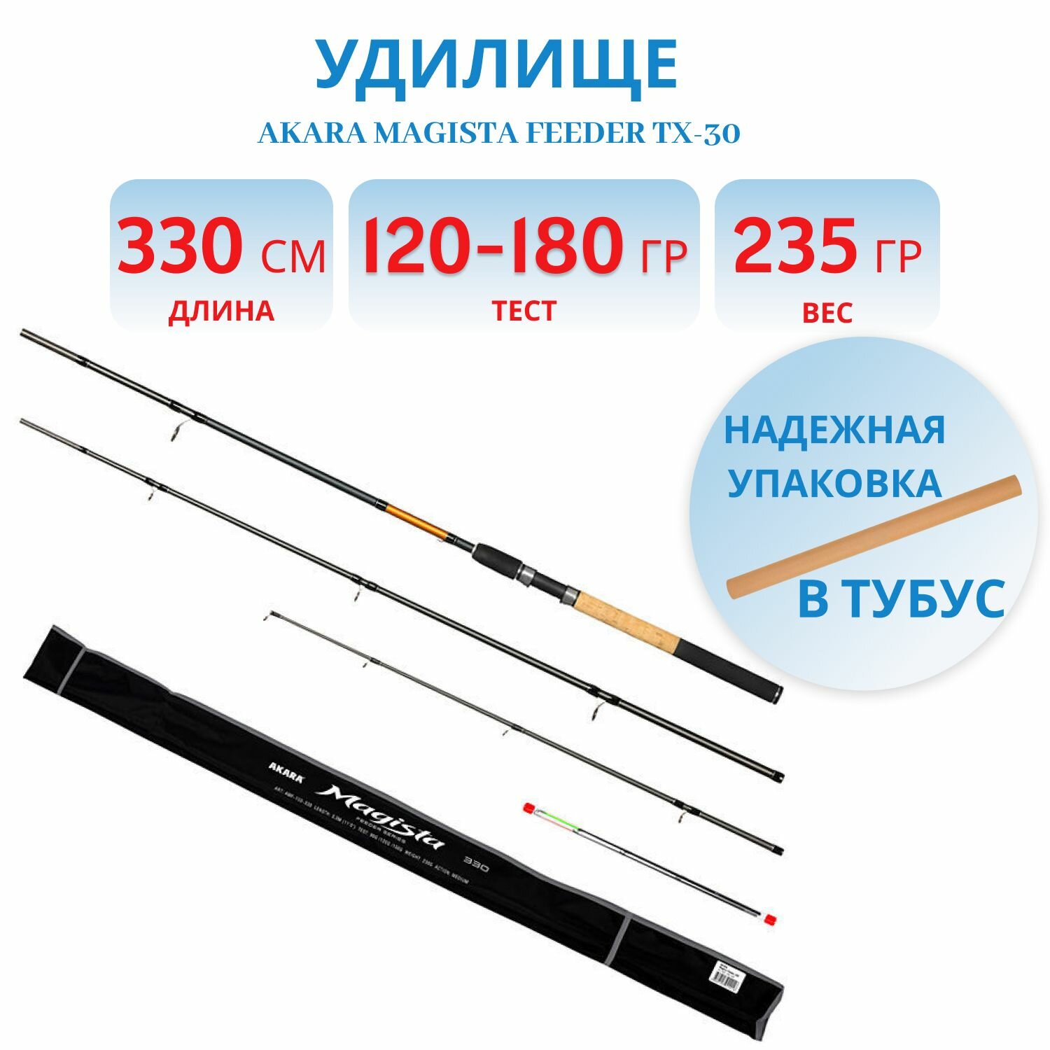 Фидер Akara Magista Feeder - это расширение уже известной серии спиннинговых удилищ и рыболовных катушек Magista. Фидерное удилище обладает строем Medium (средний). Представлено в трех тестах 60-90-120, 90-120-150 и 120-150-180 грамм. Бланки удилищ Akara Magista Feeder выполнены из высокомодульного карбона TX-30 производства Японского концерна Toray. Бланк удилища оснащен кольцами Kujira с покрытием оксида циркония, что позволяет не повреждать леску при ее использовании во время заброса кормушки или вываживании рыбы. Цельная рукоять удилища выполнена из пробки и неопрена и оснащена надежным катушкодержателем.