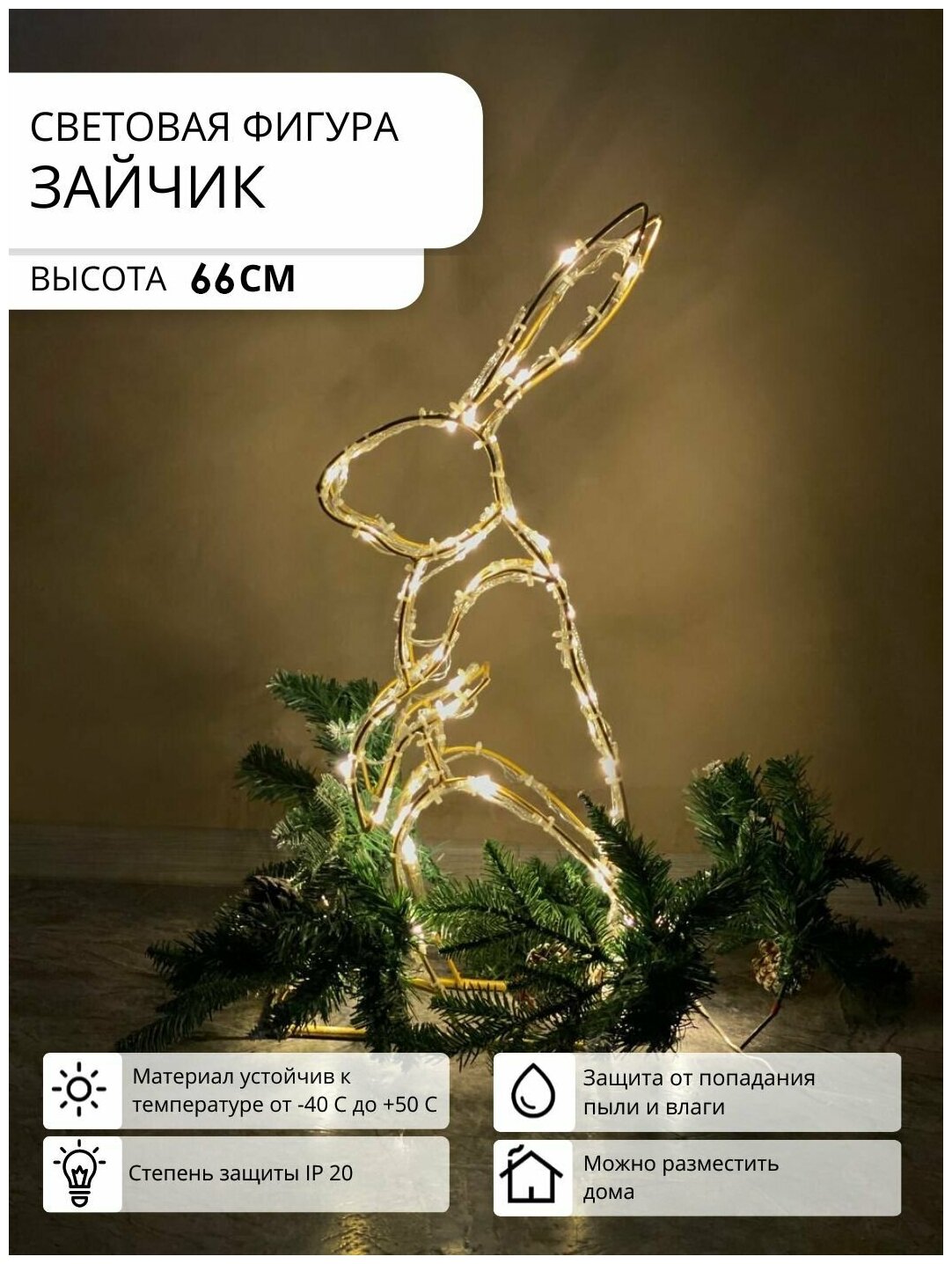 Световая фигура Сказочный зайчик для дома Фигура световая Зайчик сказочный - замечательная декорация для ярких и запоминающихся фото. Светодиодная новогодняя фигура создаст праздничное настроение, атмосферу сказки, домашний уют. Фигура под елку Зайчик станет оригинальным подарком не только для детей, но и взрослых. Украшение для дома будет радовать вас не только в праздник. Яркий, сверкающий в лучах свечей и новогодних гирлянд, этот декор станет завершающим штрихом в интерьере к новогоднему торжеству и Рождеству. Светодиодная фигура выполнена методом холодного цинкования, диаметр металлической проволоки (ГОСТ 3282-74) составляет 4-6 мм. Сказочный зайчик обязательно создаст в доме чарующий дух и атмосферу новогоднего чуда. Габариты Длина: 30 см; Глубина: 10 см; Высота: 65 см. Степень защиты освещения: IP20; Комплектация: каркасная фигура, оснащенная гирляндой, блок питания, провод - 50см. Фигура НЕ предназначена для размещения на улице.