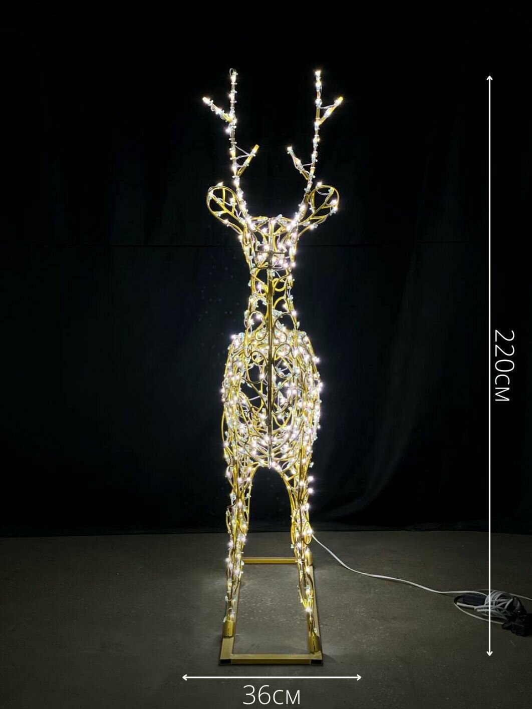 Световая фигура уличная Рождественский олень большой - замечательная декорация для ярких и запоминающихся фото, объёмная 3D. Также украсит Вашу придомовую территорию, одарив праздничной обстановкой. Светодиодная новогодняя фигура создаст праздничное настроение, атмосферу сказки и уют. Фигура Оленя станет оригинальным подарком не только для детей, но и взрослых. Светодиодная фигура выполнена методом холодного цинкования (максимальный коэффициент прочности IK 10), диаметр металлической термообработанной проволоки (ГОСТ 3282-74) составляет 4-6 мм. Украшение для дома и улицы будет радовать вас не только в праздник. Яркий, сверкающий в лучах свечей и новогодних огней, этот декор станет завершающим штрихом к новогоднему торжеству и Рождеству. Садовая фигура служит не только декоративным элементом, но и несет практическую пользу как садовый светильник. Садовая фигура Рождественский олень оснащена светодиодами с максимальной степенью защиты - IP 67, это значит что фигура не выйдет из строя даже при неблагоприятных погодных условиях. Не грозит короткое замыкание или выход из строя из-за попадания пыли, влаги от снега или дождя. Мощность составляет 0,2 Вт, напряжение 12В. Выдерживает температуру от -40°C до +50°C. Рождественский олень обязательно создаст в любом пространстве чарующий дух и атмосферу новогоднего чуда. Габариты Длина: 165 см; Глубина: 36 см; Высота: 220 см. Степень защиты освещения: IP67; Комплектация: каркасная фигура, оснащенная светодиодной лентой, блок питания, провод - 5м. Фигура предназначена для размещения дома и на улице.