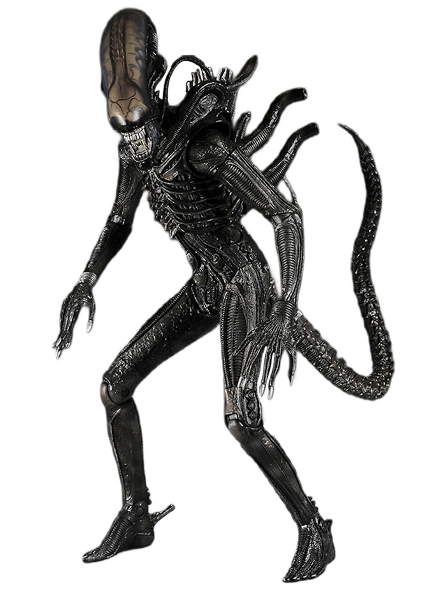 Фигурка Чужого (Alien), агрессивного инопланетного существа из одноименной серии научно-фантастических фильмов ужасов. Модель выполнена из ПВХ, имеет внушительную высоту - 52 см (прим. StarFriend).