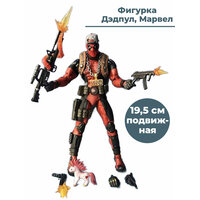 Фигурка Дэдпула (Deadpool), персонажа вселенной комиксов Марвел (Marvel). Данная модель отличается обилием аксессуаров, в комплекте представлены сменные головы и кисти, обширный арсенал оружия, огнестрельного и холодного, а также игрушечный единорог (прим. StarFriend).