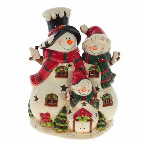 Эта фигурка - яркое, доброе чудо. Дружная семейка снеговиков решила поздравить всех с Новым годом и подарить свои улыбки. Изделие с подсветкой. Свечение: 2 режима - цветное и желтое. Работает от трех батареек ААА (не прилагаются).