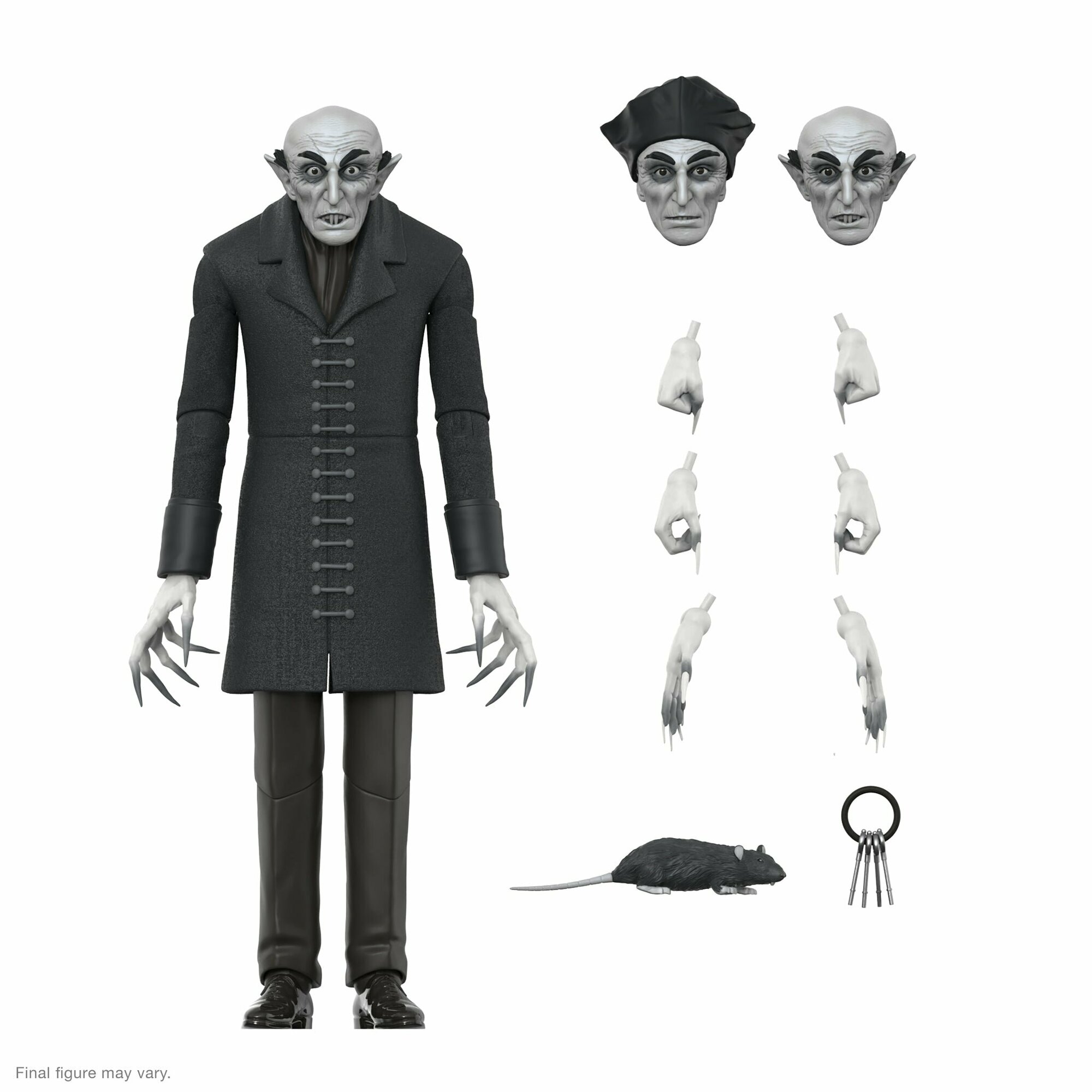 Первый и самый жуткий облик вампира на киноэкранах, Граф Орлок из шедевра Мурнау "Носферату" получал самые разные воплощения в виде фигурок и статуэток, и вот на этот раз к нам спешит компания Super7 со своим виденьем этого черно-белого красавца в определенно ультимативном качестве - подвижное тело, полное соответствие образу, отличная покраска и все необходимые бонусы для разнообразных поз - три головы в комплекте, сменные ладони с различной жестикуляцией, связка ключей и крыса - все это под покровом стильной коробки.