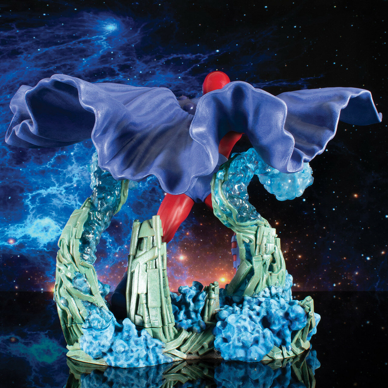 Diamond Select изо всех сил постарались передать все детали облика, наделив композицию эффектной динамикой, снабдив реалистичной детализацией и покраской, имитирующий посредством полупрозрачного пластика эффекты в ладонях и свечение плаща, и вдобавок украсив тематической базой-диорамой, которая элегантно вписывается в коллекцию к остальным фигуркам серии Marvel Gallery.