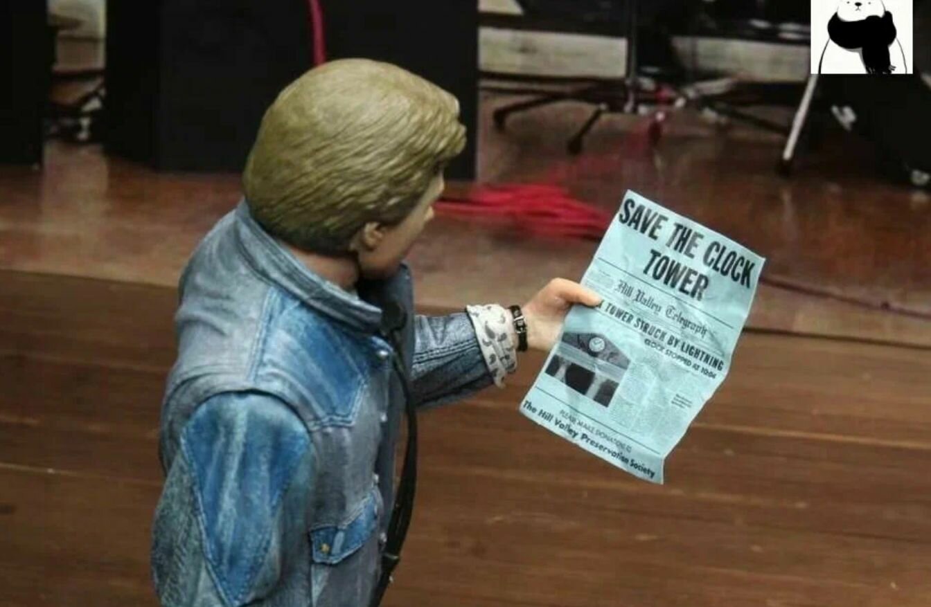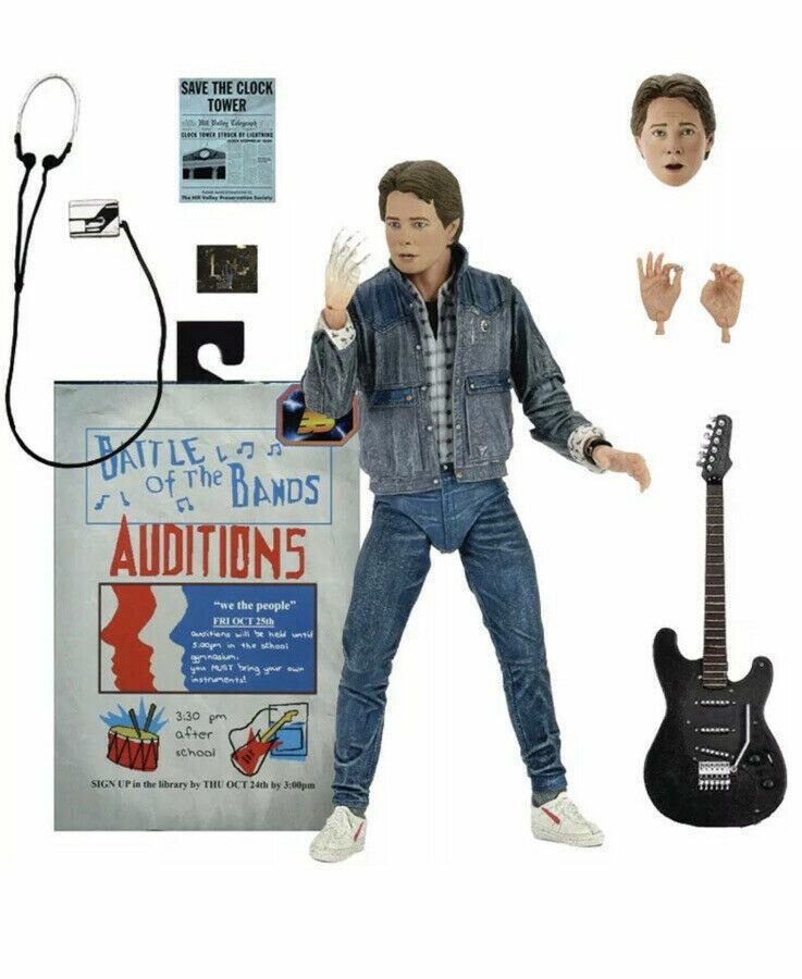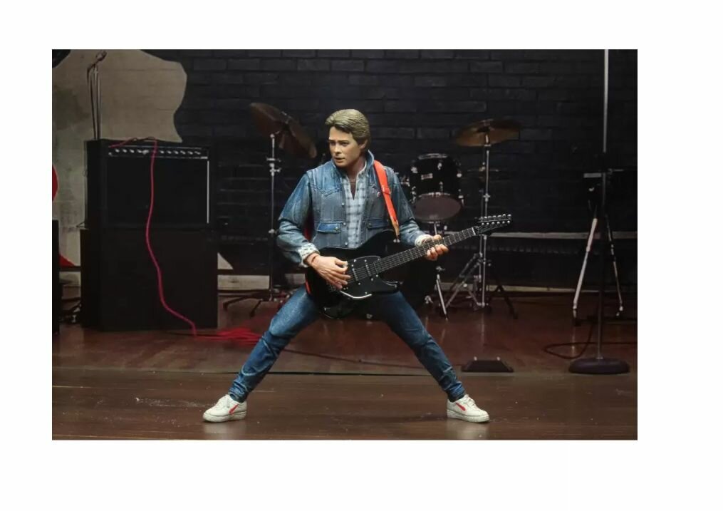 Фигурка главного героя из фантастической приключенческой трилогии «Назад в будущее» созданной Робертом Земекисом в 1985–1990 годах. Фигурка Марти МакФлая (Marty McFly), героя культовой трилогии "Назад в будущее" (Back to the Future), Модель изображает Марти из первой части, в его "джинсовом" образе на прослушивании группы (прим. StarFriend). Фигурка пластиковая, высотой 18 см. Модель подвижная, персонаж может принимать различные позы. В комплекте с фигуркой идут 2 маски для лица, гитара, сменная ладонь с эффектом "исчезновения", листовка, фотография и плеер с наушниками.