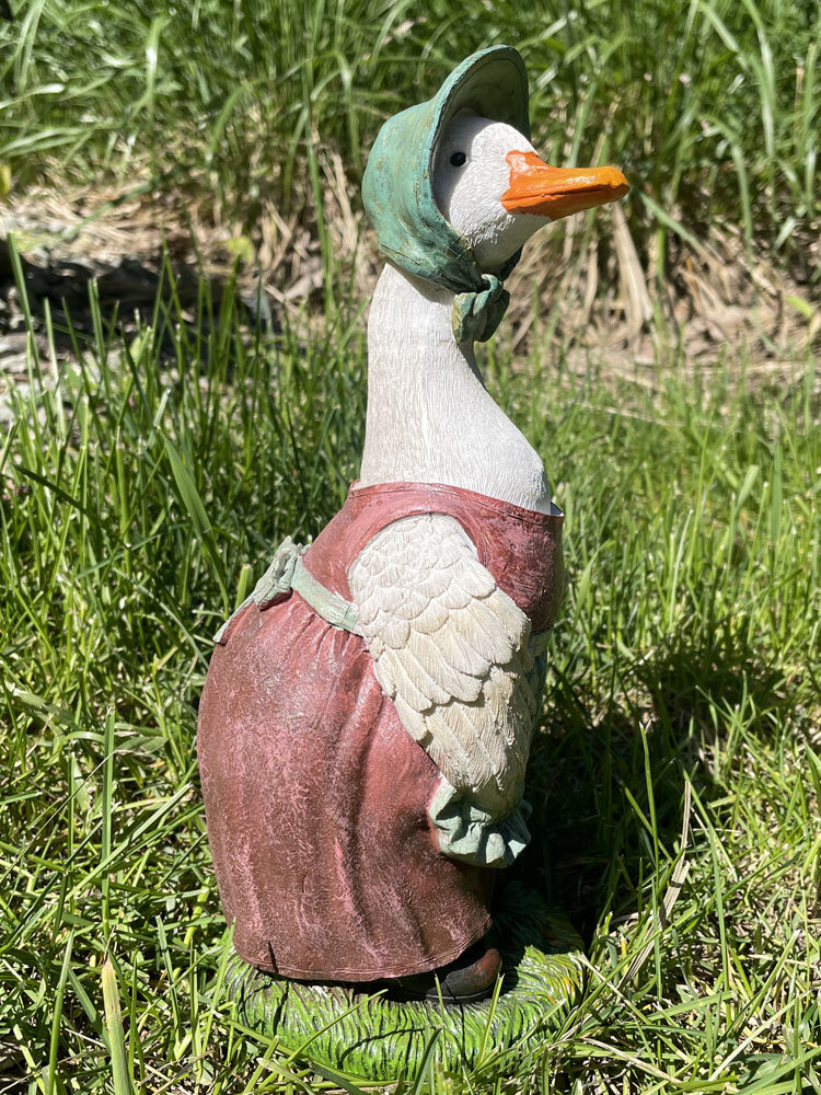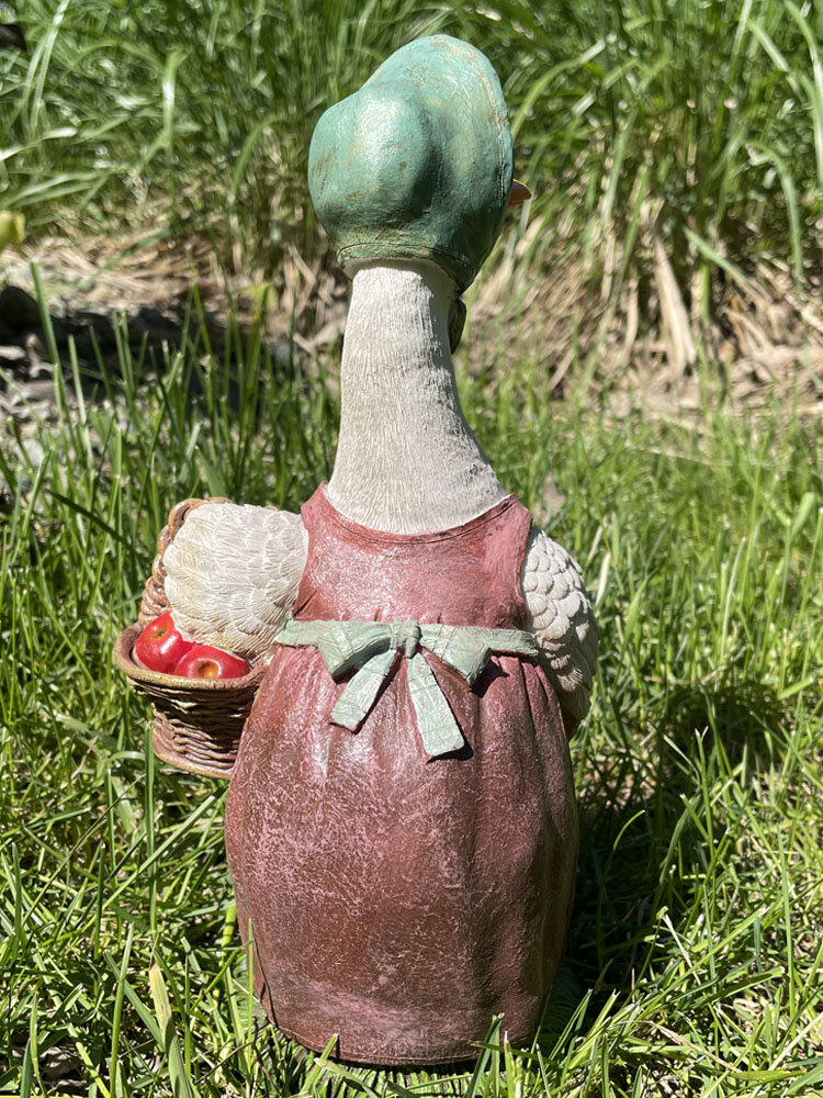 Гусыня несет в плетёной корзинке спелые яблоки. Натуралистичная проработка оперения с эффектом мягкого объёма добавляет динамичности образу. Ручная роспись в светлых тонах на перьях, сочные акценты на яблоках. Чепчик на голове и клетчатый фартук в деревенском стиле.