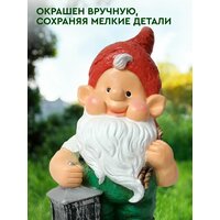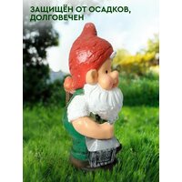 Фигурка имеет размеры 24х19х42 см и выполнена в бежевом, красном, темно-зеленом и сером цветах. Это позволяет ей гармонично вписаться в любой ландшафт, будь то небольшой сад или большая дача.
