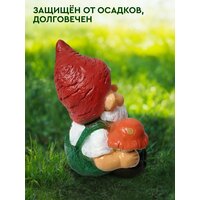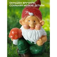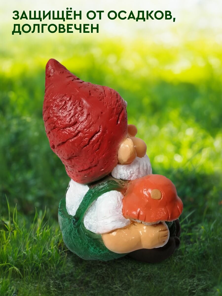 "Гном с грибочком" выполнен в бежевом, красном, зеленом и белом цветах, что позволяет ему гармонично вписаться в любой ландшафт. Тематика персонажей делает эту фигурку особенно привлекательной для любителей активного загородного отдыха и творчества.