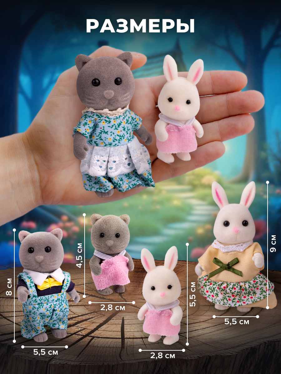 Семейство кукол-зверят зайчики котики — это очаровательный набор мини-фигурок, который понравится детям и особенно подойдёт для девочек от 3, 4 и 5 лет. В комплект входят маленькие животные: милые коты и пушистые зайчеки, поэтому дети смогут придумать множество игровых историй. Эти куклы легко использовать вместе с популярными коллекциями Sylvanian Families (Сильвани, Сильваниан) или другими кукольными домиками, включая бренд WIMI или сильвани фемели.