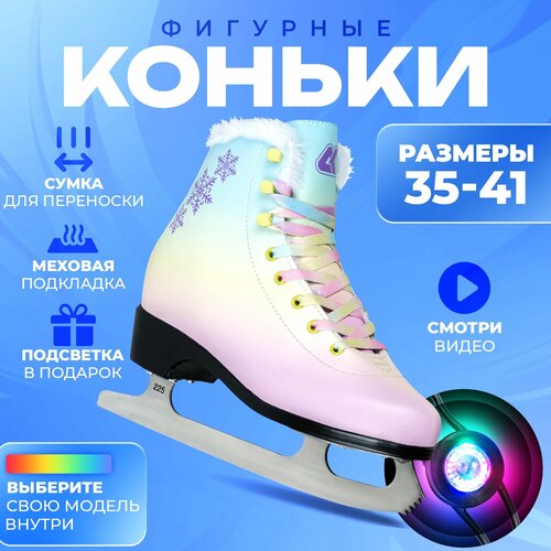 Фигурные коньки С подсветкой утепленные для любительского катания из искусственной кожи. Материал: искусственная кожа. Язык: искусственная кожа, войлок. Подкладка: искусственный мех. Стелька: EVA. Лезвие: нержавеющая сталь. Упаковка: сумка из влагостойкой ткани на молнии для переноски и хранения коньков.