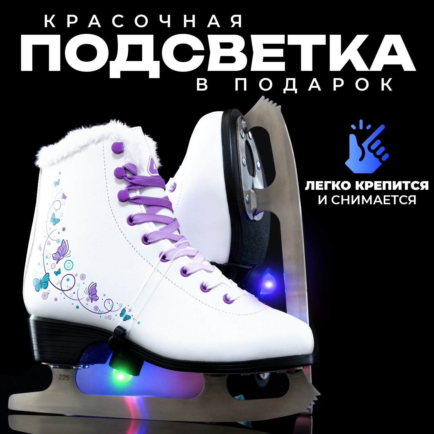 Фигурные коньки С подсветкой утепленные для любительского катания из искусственной кожи. Материал: искусственная кожа. Язык: искусственная кожа, войлок. Подкладка: искусственный мех. Стелька: EVA. Лезвие: нержавеющая сталь. Упаковка: сумка из влагостойкой ткани на молнии для переноски и хранения коньков.