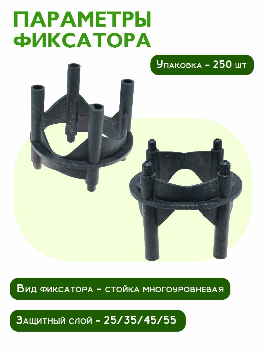 Фиксатор для арматуры Многоуровневый необходим для формирования защитного слоя в 25, 35, 45, 55 мм перед заливкой опалубки. Специальная форма и конструкция позволяет надстраивать фиксаторы друг на друга. При этом в каждый из ярусов возможно установить арматуру диаметром от 4 до 32 мм. Изготовлен из прочного пластика - устойчив к разрушению и перепадам температуры. Для установки на мягком, сыпучем грунте или изоляционном материале рекомендуется дополнительно использовать фиксатор «Подставка».