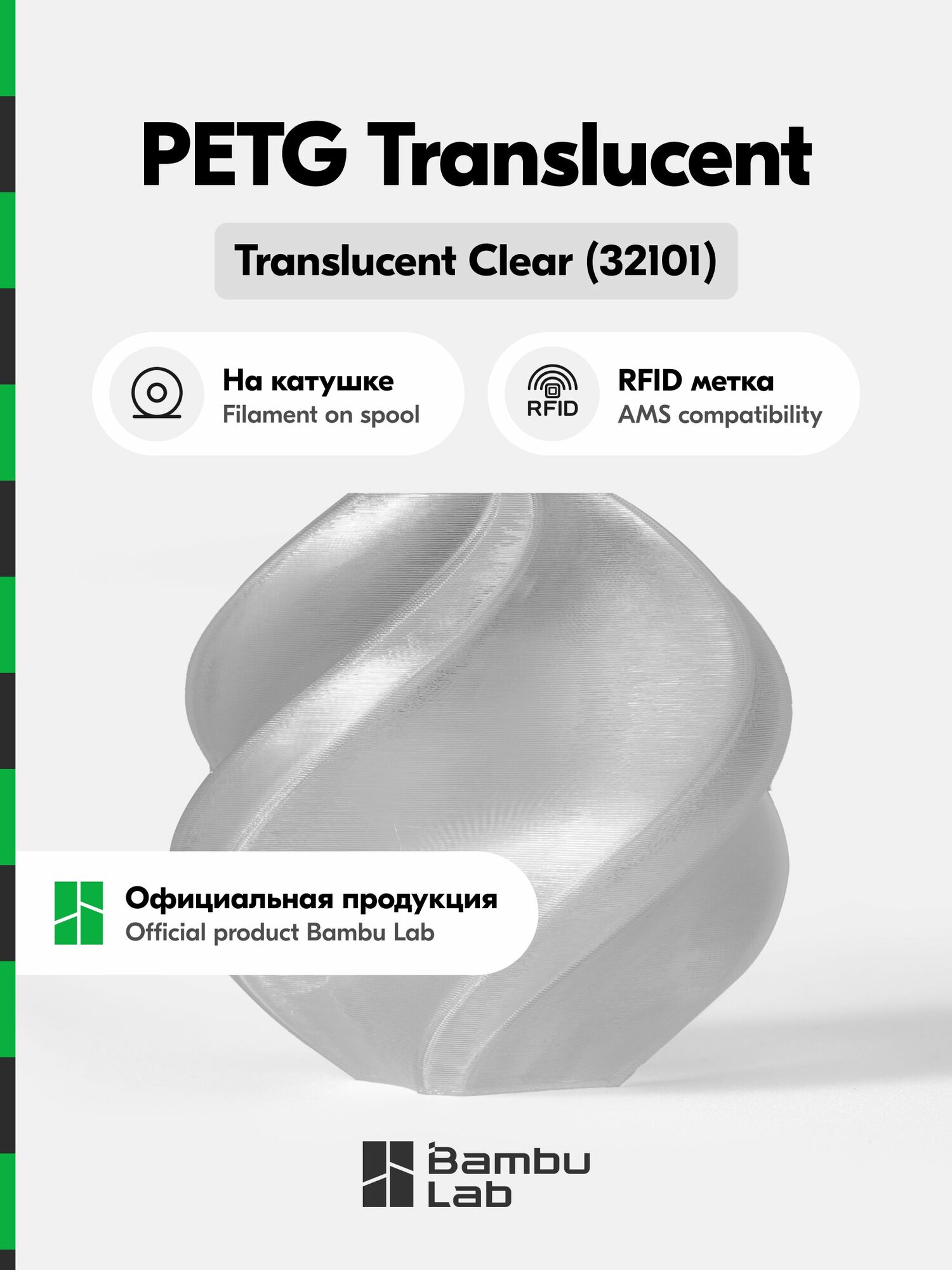 Серия полупрозрачных материалов Bambu PETG отличается оптимизированной формулой, которая обеспечивает бесшовный процесс 3D-печати. Эта формула помогает свести к минимуму такие распространенные проблемы, как скручивание, слипание, залипание сопел и протекание, эта нить гарантирует беспроблемную работу.