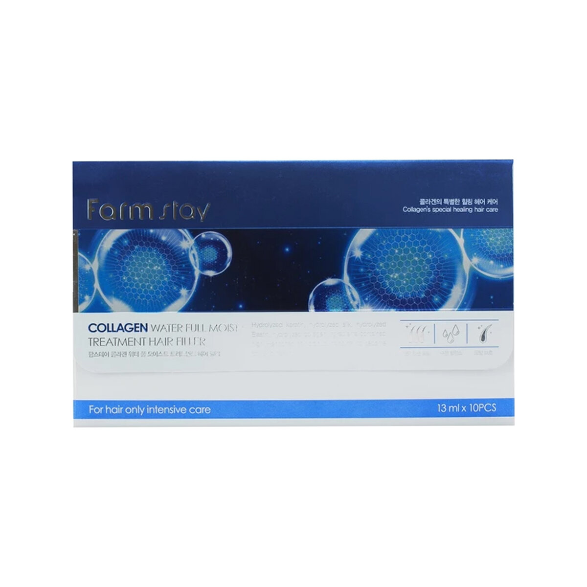 Без регулярного ухода волосы под воздействием внешних факторов легко теряют красоту и превращаются в безжизненные, сухие и ломкие. Увлажняющий филлер для повреждённых волос с коллагеном FarmStay Collagen Water Full Moist Treatment Hair Filler обеспечит локонам комплексный уход, способствующий восстановлению кожи головы и улучшению структуры волос от корней до самых кончиков.