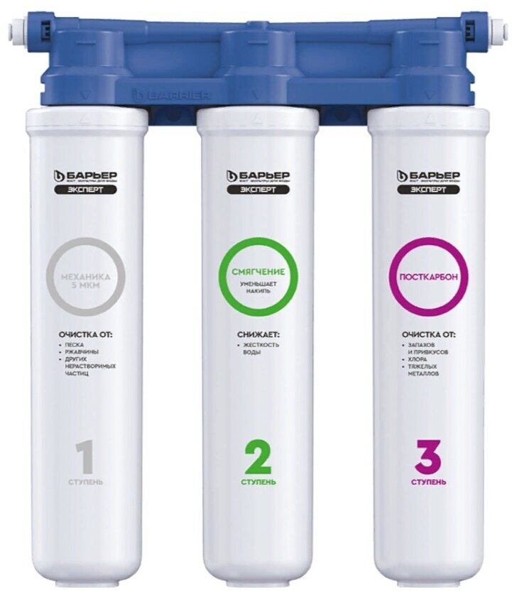 в комплекте картридж ЭКСПЕРТ Механика, картридж ЭКСПЕРТ Смягчение, картридж ЭКСПЕРТ ПостКарбон; технология SmartLock предотвращает извлечение фильтроэлемента под давлением