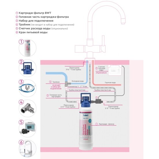 3. Умягчение воды для предотвращения образования накипи + Минерализация и обогащение воды магнием благодаря запатентованной технологии BWT Magnesium Technology для нормализации минерального баланса в воде. Магний является вкусовым и ароматическим носителем, улучшая органолептические свойства любых напитков и еды, приготовленной на такой воде. Также магний полезен для здоровья, помогая укреплять иммунитет