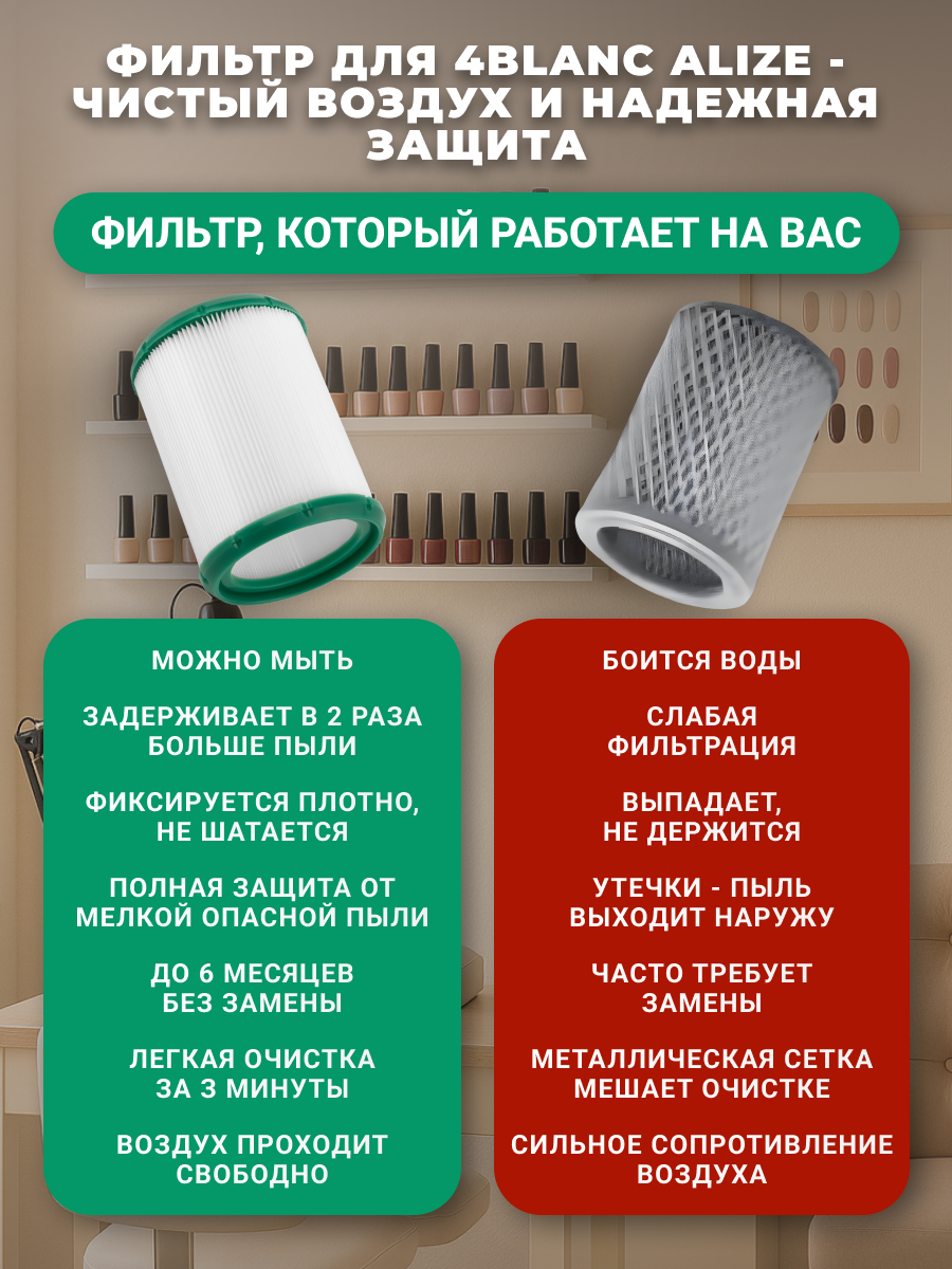 Сменный фильтр для маникюрной вытяжки 4BLANC Alize разработан для мастеров маникюра и педикюра, снижает вредное воздействие паров при проведении процедур кератина, ботокса, нанопластики, окрашивания волос. При обработке стопы мелкодисперсная пыль остаётся в фильтре вытяжки для педикюра, что полностью защищает здоровье мастера и клиента.