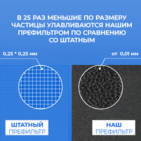 Он защищает штатный фильтр от преждевременного загрязнения, т. к. основная нагрузка приходится на префильтр, а не на фильтр тонкой очистки. Штатная, тонкая сетка, которая выступает в роли фильтра предварительной очистки , имеет большие отверстия, которые видны невооруженным глазом. Через них свободно проникает крупнодисперсная пыль, аллергены, другие загрязнители, и всё это забивает фильтр тонкой очистки.