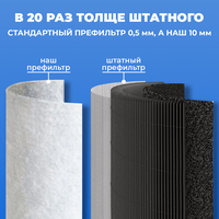 Зазоры между волокнами нашего префильтра от 250 раз меньше, чем решетка штатного фильтра. Соответственно, эффективность улавливания загрязнителей от 250 раз выше, чем у штатной решетки основного фильтра.