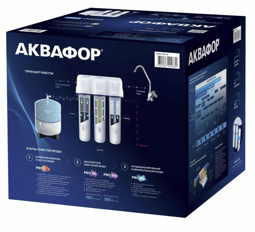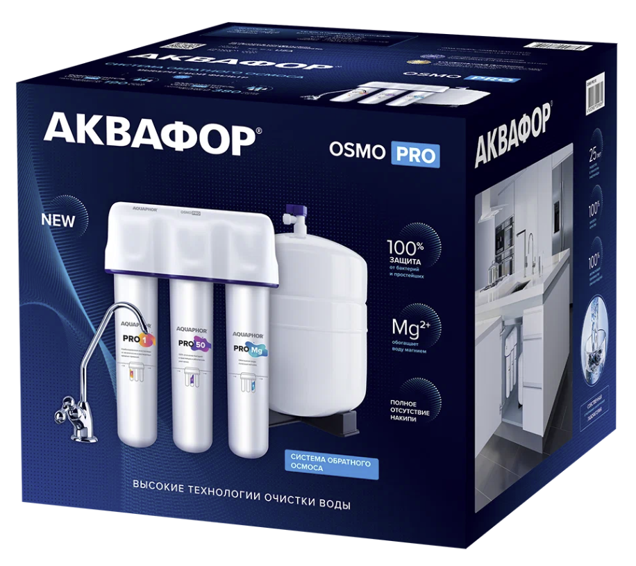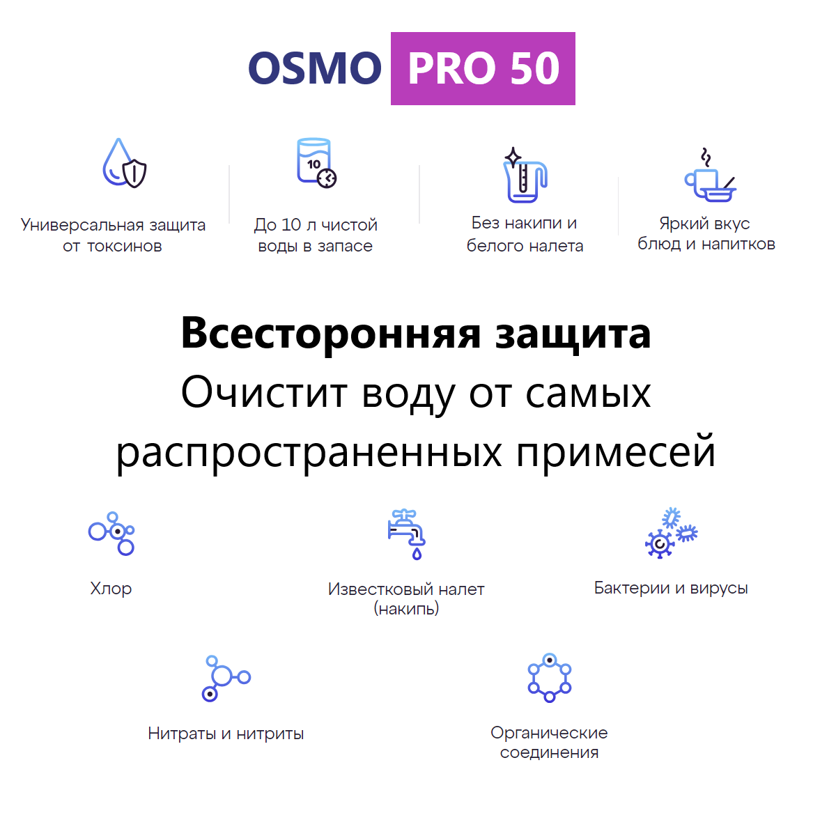Благодаря ультратонкой очистке воды, АКВАФОР Osmo Pro 50 удалит даже самые опасные примеси, включая токсичные вещества, бактерии и вирусы, — система полностью заменит воду из пластиковых бутылок. Используйте только свежую отфильтрованную воду для питья, кулинарии, детского питания и домашней бытовой техники.