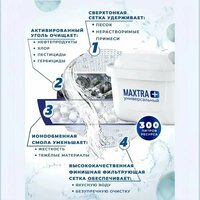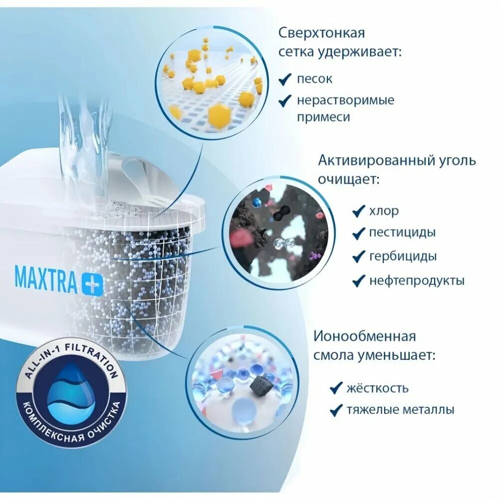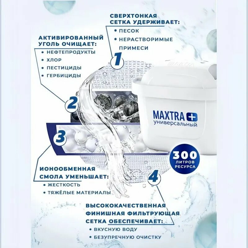 Фильтр BRITA MAXTRA+ Универсальный - мощная очистка воды. Преимущества:- Разработан немецкими инженерами с учетом специфики российскойводы мягкой и средней жёсткости.- На 30% увеличена площадь впитывающей поверхности микро гранул активированного угля из натуральной скорлупы кокосового ореха- Стерилизованы паром 130 градусов и обработаны активным серебром для защиты от микробов- Существенная экономия на бутилированной воде – литр очищенной воды до 40 раз дешевле литра бутилированной воды**По внутренним исследованиям ООО «брита», из расчета: численность семьи 3 чел; среднее потребление – 2,5 л./день; при средней цене за 1 л. бутилированной воды ≈40 руб.- Ресурс фильтра – до 300 литров или 8 недель использования- Эффективность доказана в соответствии с Санитарными Правилами и Нормами СанПин 2.1.4.1-74-01Очитска водопроводной воды от:- Хлора, пестицидов, гербицидов- Нефтепродуктов- Металлов: железа, свинца, меди, алюминия, ртути- Снижает избыточную жесткость