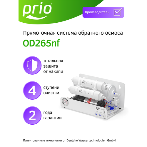 Компактная система обратного осмоса OD265nf (без крана) с инновационной мембраной из полимерной пленки Toray Industries Inc, Япония, обеспечивает универсальную очистку водопроводной воды от распространенных загрязнителей: механических примесей (ржавчины, ила, песка и т. п.), растворенных примесей, таких как свободного хлора, хлорорганических соединений, пестицидов, гербицидов, сельскохозяйственных удобрений и продуктов их распада, фенолов, нефтепродуктов, алюминия, тяжелых металлов, радиоактивных элементов, растворенного железа, солей жесткости и иных органических и неорганических веществ, бактерий и вирусов. Умягчает воду и полностью решает проблему накипи. Устраняет неприятные запахи, улучшает вкус воды.