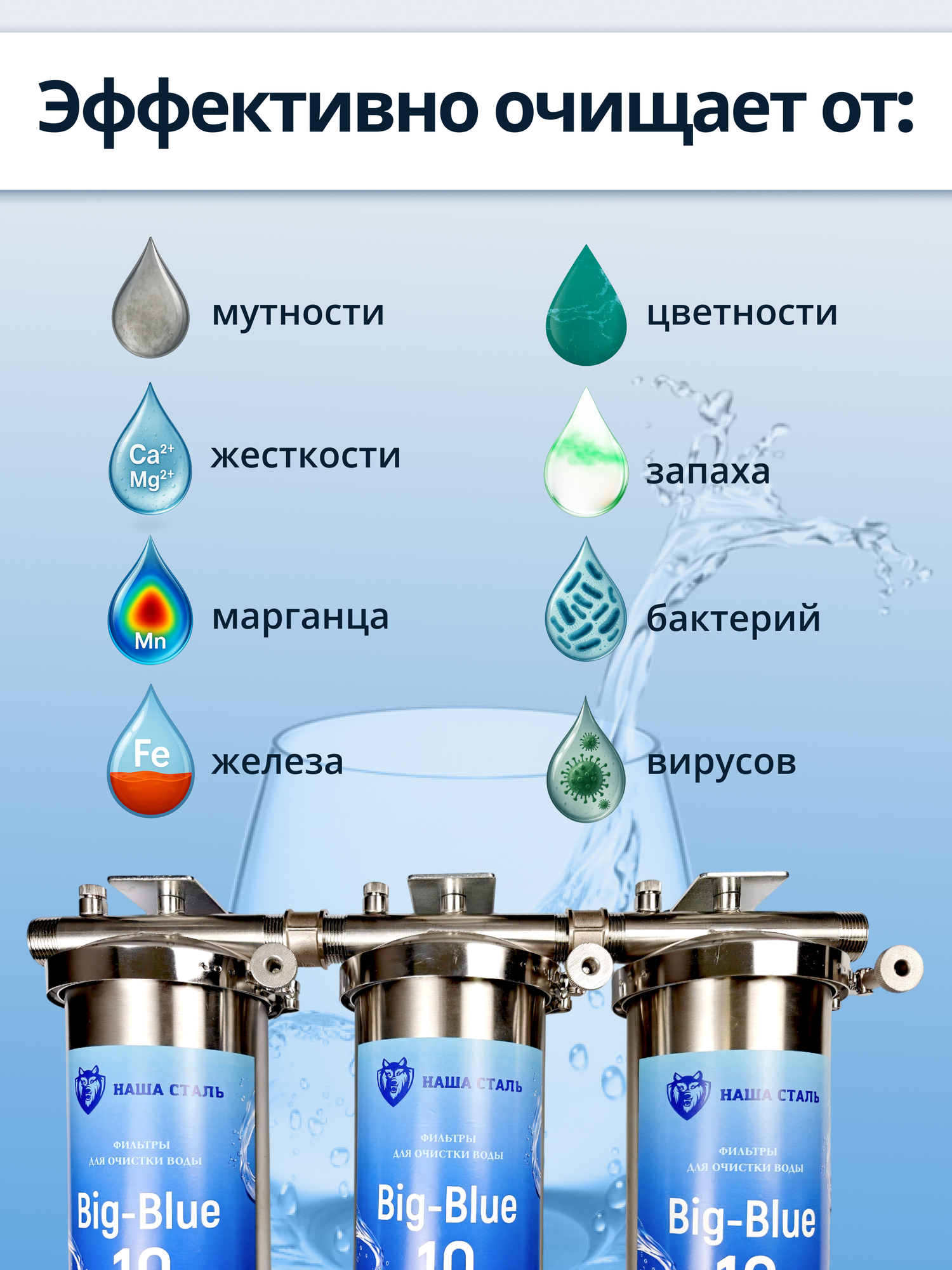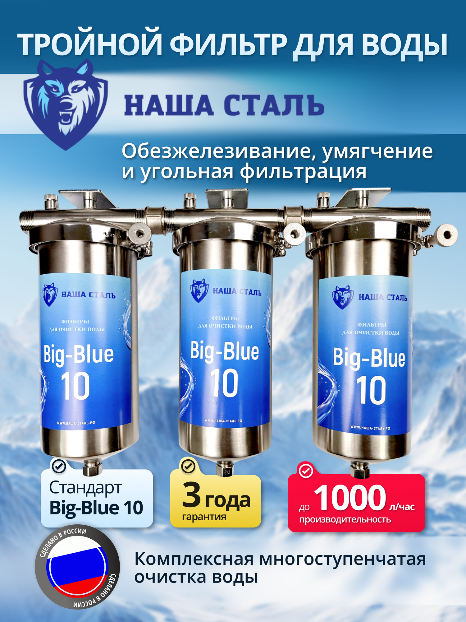 Фильтр для загородного дома BIG BLUE 10 наша сталь. Обезжелезивание, умягчение, уголь