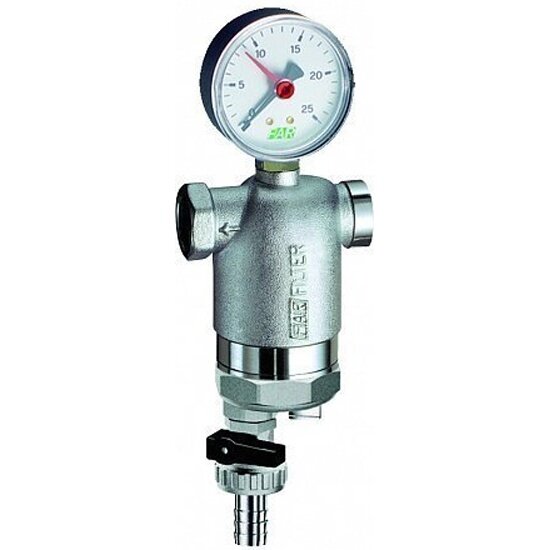Промывной фильтр механической очистки с одними манометром и сливным клапаном. Удобен для любой системы водоснабжения и отопления, т. к. имеет возможность быстрого слива скопившегося шлама и, в случае установки запорных кранов, замены или извлечения для промывки картриджа. В случае установки в системах водоснабжения по схеме с обводом имеет возможность обратной(напорной) промывки. В случае с фильтром с двумя точками подключения манометров они показывают давление на входе и на выходе. Если разница становится ощутимой, то фильтр требует промывки. Если фильтр имеет один манометр, то он показывает давление на входе в фильтр. Устанавливается фильтр по стрелке на корпусе.