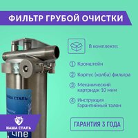| Дополнительная информация | Магистральный фильтр из нержавеющей стали для холодной и горячей воды. Производство компания НАША СТАЛЬ. Гарантия на изделие 3 года |