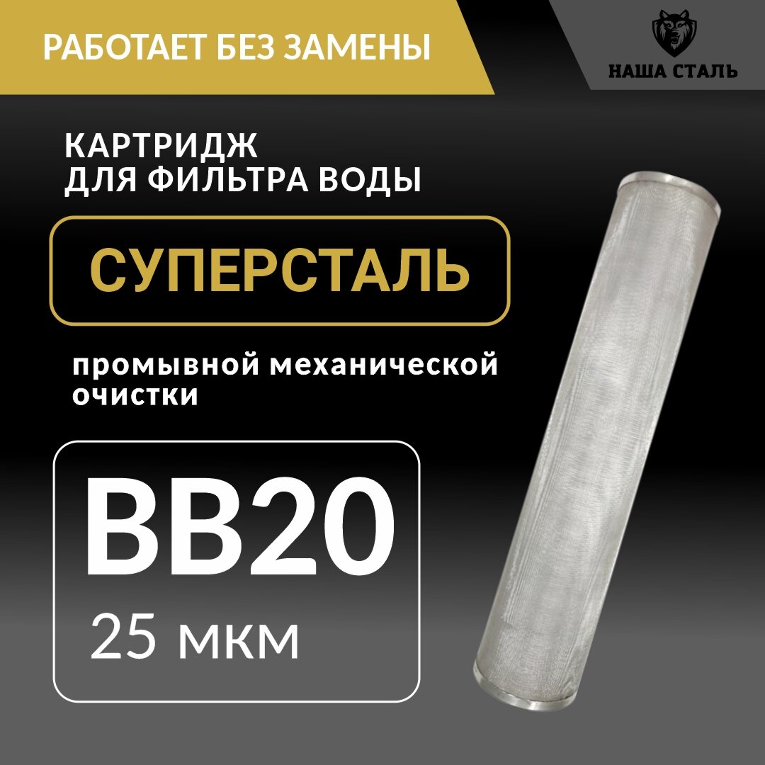 Промывной сетчатый магистральный фильтр грубой механической очистки воды "суперсталь" BB20, 25 микрон из нержавеющей стали, используется как первая или предварительная ступень очистки воды от механических примесей