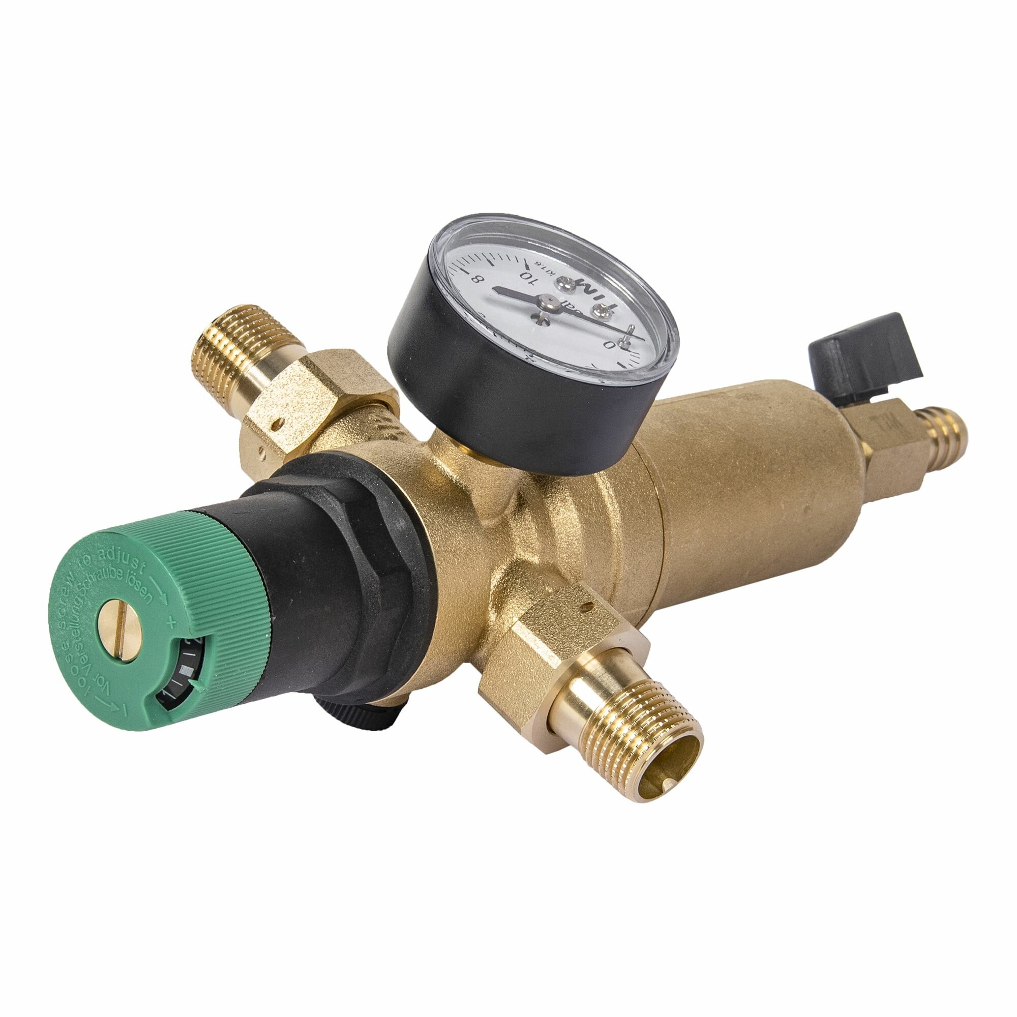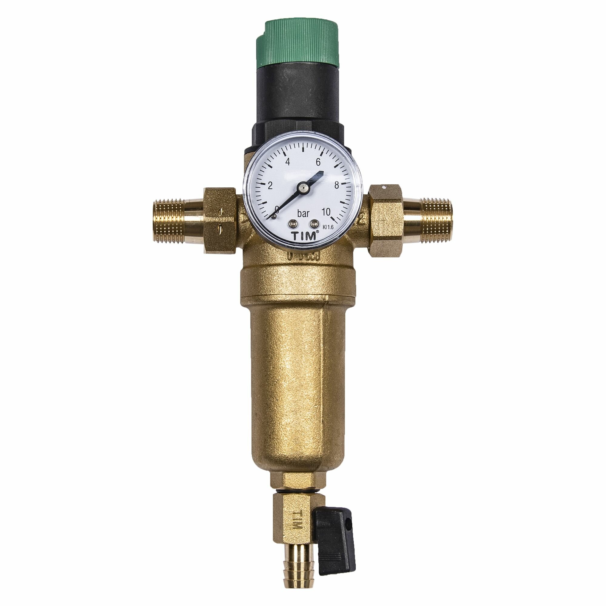Фильтр самопромывной, с редуктором давления, с манометром 0-10 бар, американками и сливным краном, TIM, 1/2" НН. Давление на выходе, регулируемое: 1-6 бар. Давление на входе: до 16 бар. Максимальная рабочая температура: 110 гр. Материал корпуса - латунь. Фильтрующий картридж 100 мкр. Для систем водоснабжения и отопления. Предназначен для холодной и горячей воды/теплоносителя.