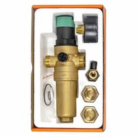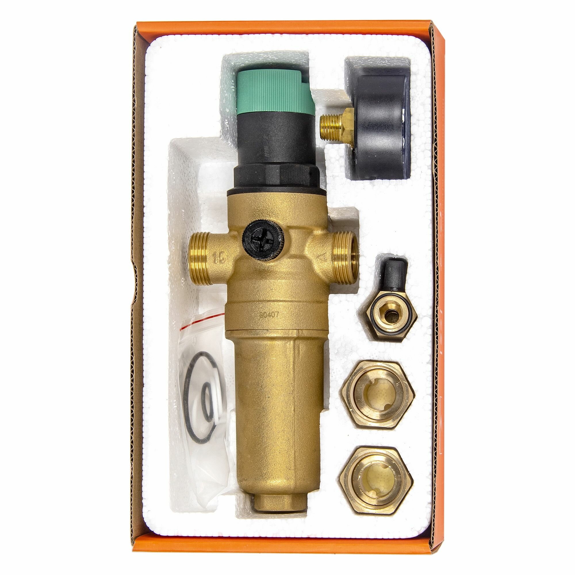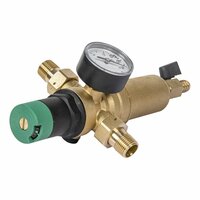 соединительный размер 1/2"; номинальный диаметр G 3/4; фильтр самопромывной, с редуктором давления и стеклянным корпусом, с манометром, американками и сливным краном со штуцером