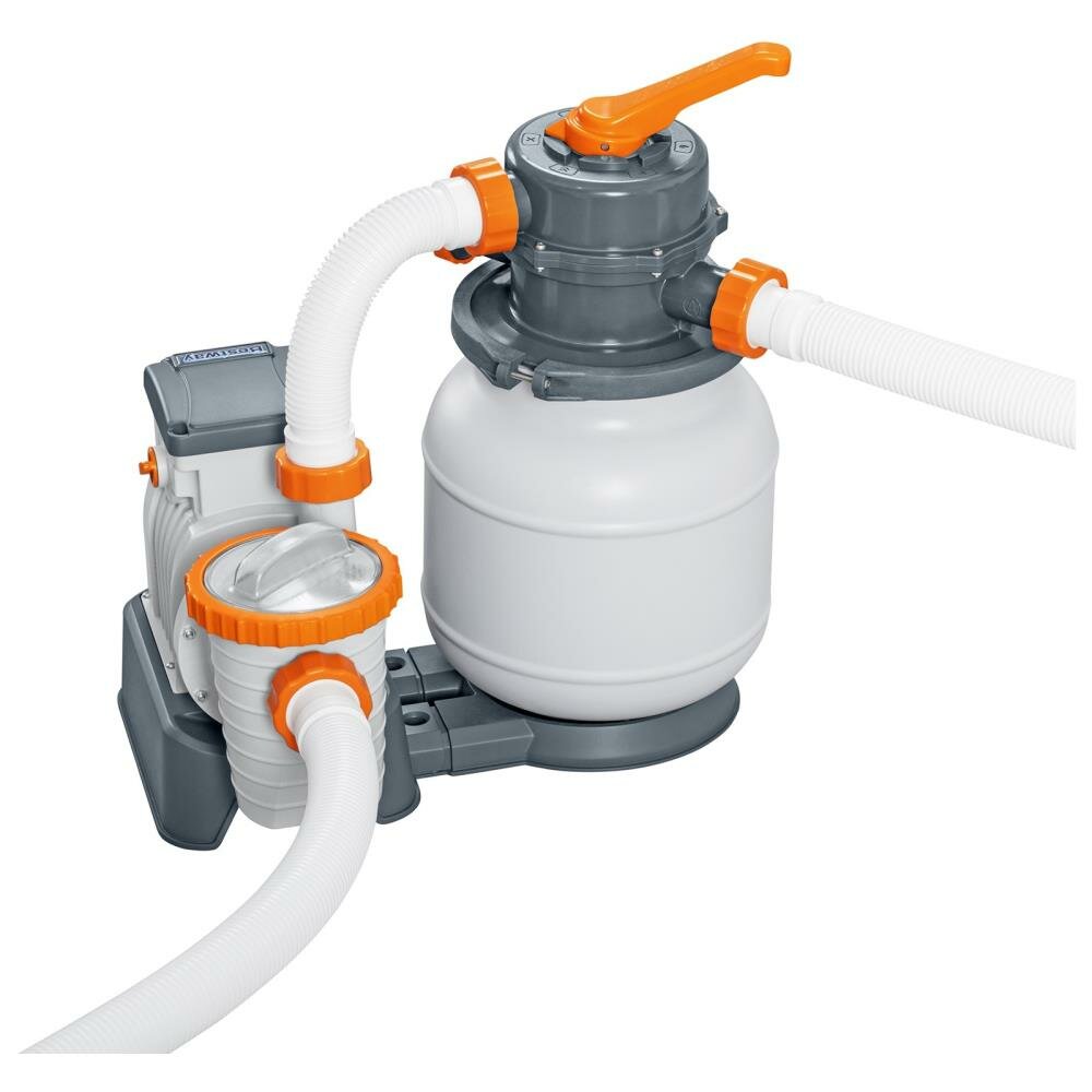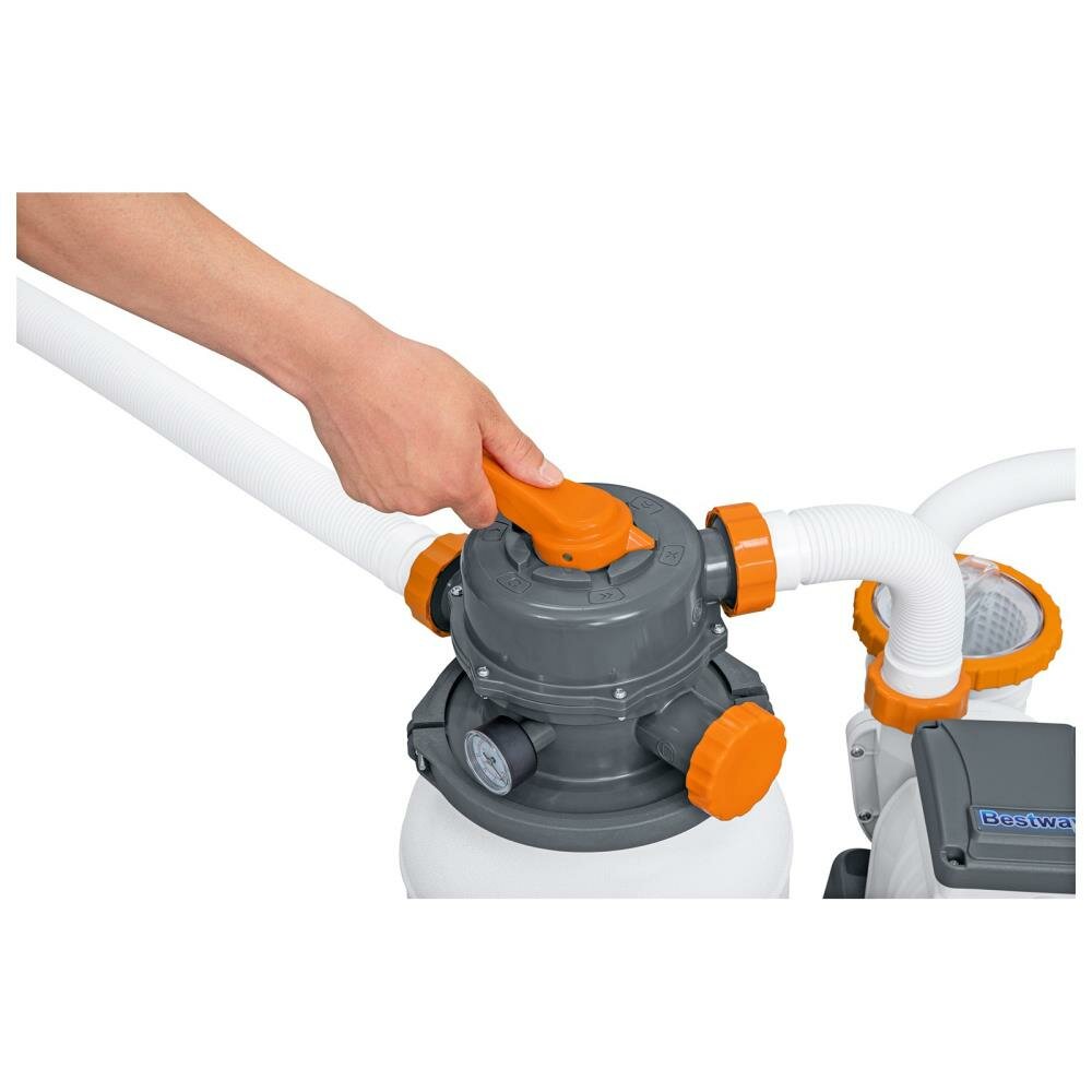 Фильтровальная установка песочного типа Bestway 58497 для домашних надувных и каркасных бассейнов объемом от 1100 до 42300 литров. Насос простой надёжной конструкции с двойной изоляцией и клапаном для воздуха требует минимального обслуживания. Подключается к бассейну двумя шлангами, которые надёжно фиксируются хомутами. Для фильтрации воды используется очищенный кварцевый песок, который очищает воду на 30% эффективнее картриджных насосов и меняется раз в два года. Для удобства оснащён шестью режимами работы с обратной промывкой. Для очистки от крупного мусора имеется специальная корзинка-скиммер.Особенности:Номинальный расход (производительность насоса): 5678 л/часОбщий расход воды в системе бассейна (расход воды в системе): 5300 л/часПрочный, коррозионно-устойчивый бак фильтра.6-позиционный клапан обеспечивает легкость управления насосом.Встроенный таймер дает возможность задавать период работы.Конструкция хомут