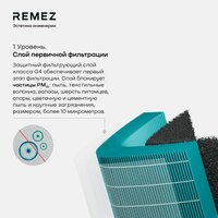 Композитный НЕРА13+угольный фильтр Антиформальдегид AOF BLOCK для климатического комплекса REMEZ AirCreator RMC-411 (модуль воздух) состоит из высокотехнологичных материалов, создающих 3 уровня надежной защиты. Уровень 1. Слой первичной фильтрации. Защитный фильтрующий слой G4 обеспечивает первый этап фильтрации. Слой блокирует частицы РМ10: пыль, текстильные волокна, волосы, шерсть питомцев, споры, цветочную и цементную пыль и крупные загрязнения размером более 10 микрометров. Уровень 2. Высокоэффективный слой тонкой очистки класса НЕРА13. Инновационный материал последнего поколения от японского концерна TORAY на основе более эластичных пропиленовых волокон высокой плотности. Высокоэффективный слой фильтра блокирует 99,97% микрочастиц РМ2.5 размером до 0,3 микрометра. Повышенная электростатика волокон до 43% лучше притягивает частицы загрязнений и очищает воздух от мельчайших частиц домашних аллергенов. Уровень 3. Адсорбирующий угольный слой, усиленный активными катализаторами. Специальный угольный слой, усиленный активными антиформальдегидными катализаторами. На 99% нейтрализует формальдегидное загрязнение воздуха, а также другие токсичные газы и летучие органические соединения от мебели, строительных материалов, книг, продуктов распада горения, испарителей (вейпов) и пр.