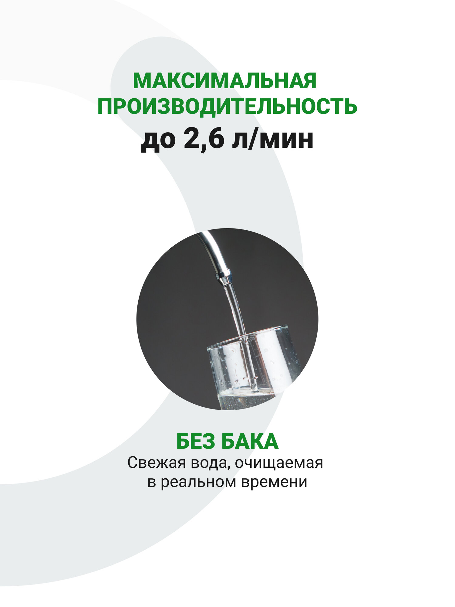 - Работа без накопительного бака: Это позволяет пить воду из фильтра без кипячения и предотвращает застойные явления.