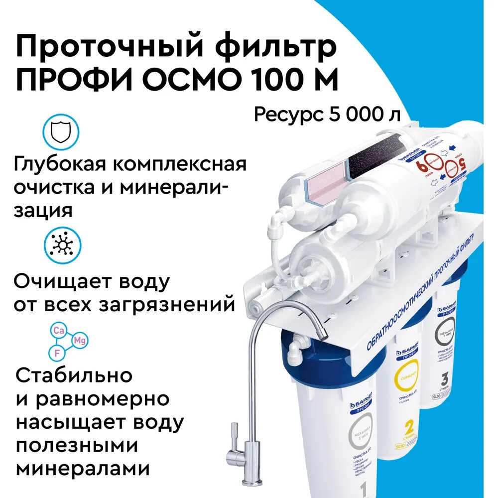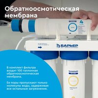 Система обратного осмоса «Профи Осмо» от российской компании «Барьер» используется для очистки воды и ее минерализации. Комплектуется шестью картриджами, проходя через которые вода становится пригодной для питья. Предусмотрено использование накопительного бака емкостью 8 литров. На столешницу устанавливают кран для подачи очищенной воды. Все необходимое для монтажа под раковину и замены картриджей входит в комплект. Срок службы оборудования составляет не менее пяти лет.