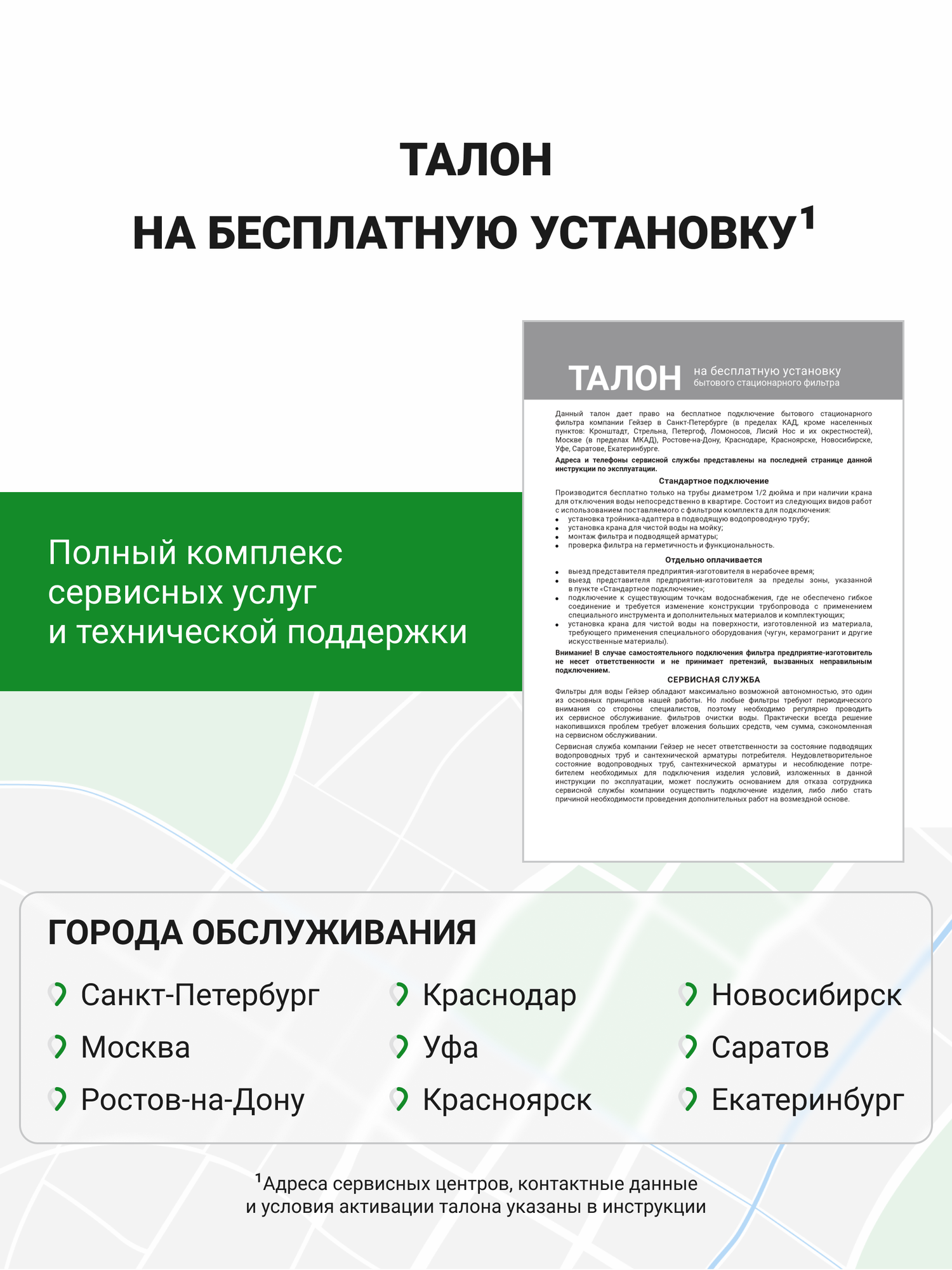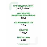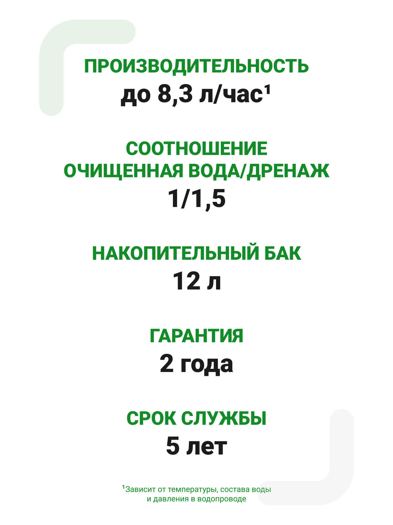 - Обратноосмотическая мембрана для глубокой очистки воды (ресурс мембраны – до 3 500 л (чистой воды);